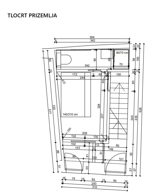 Prizemlje: dvokrevetna spavaća soba s bračnim krevetom i vlastitom kupaonicom, poseban ulaz sa ulice.