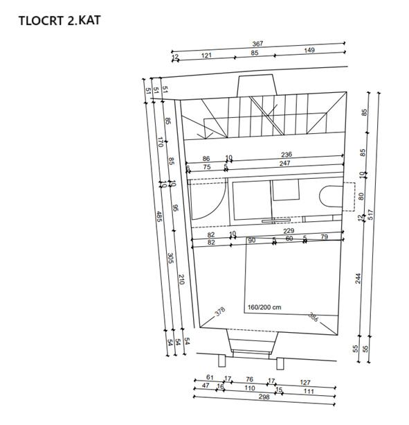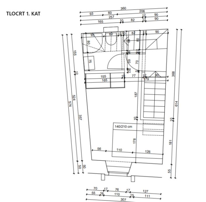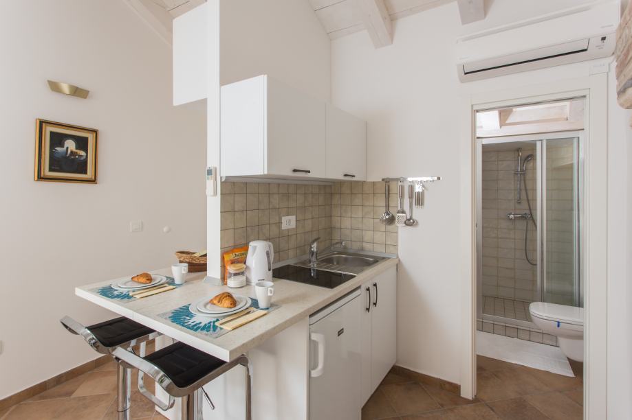 Prvi kat: studio apartman s bračnim krevetom, kuhinjom i kupaonicom.