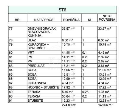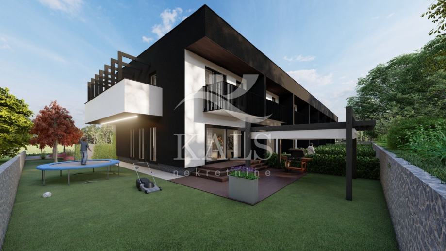 Kuća se sastoji od dnevnog boravka, kuhinje, blagovaonice, tri spavaće sobe, kupaonice s wc-om i kupaonice sa spremištem, ulaznog prostora, hodnika i stubišta, te dvije terase. Kući pripadaju dva vanjska parkirna mjesta kao i vrt površine 44,86 m2.