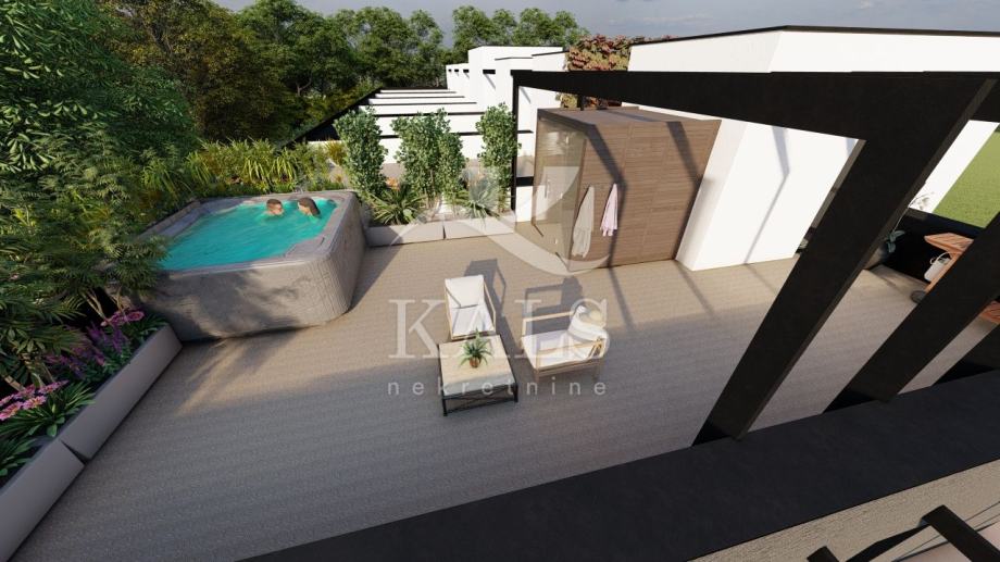 Kuća sastoji se od prizemlja i kata s izlazom na krovnu terasu.