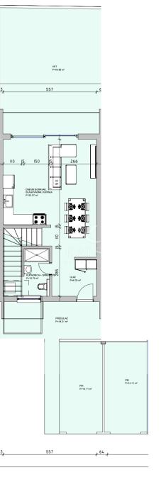 Kuća je trostrane orijentacije koja uz velike vanjske otvore i klizne stijene garantira jako puno svjetla i ugodan živući prostor.