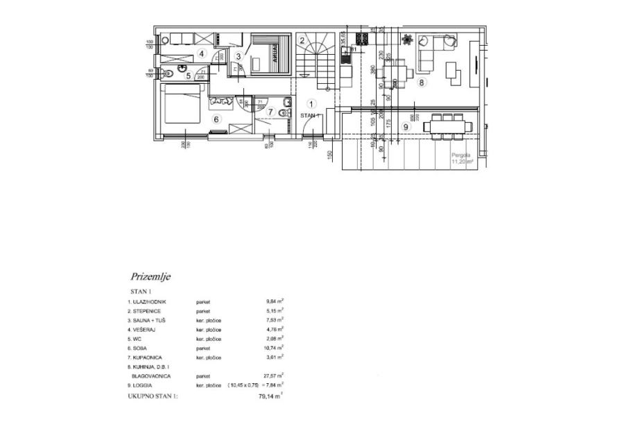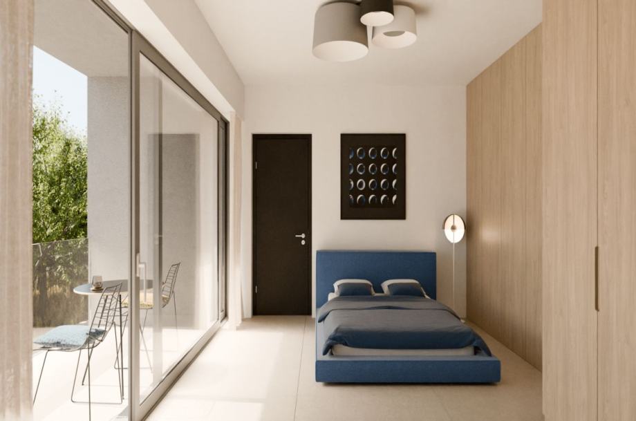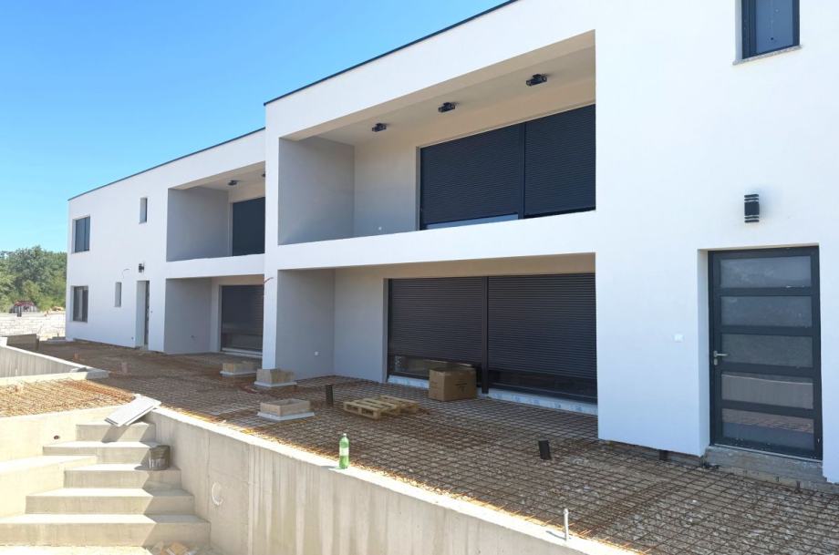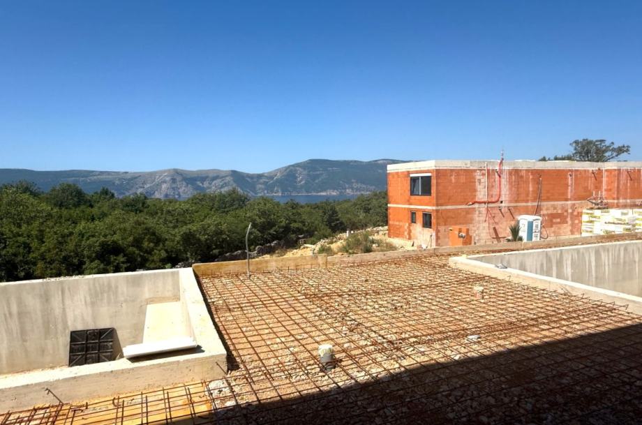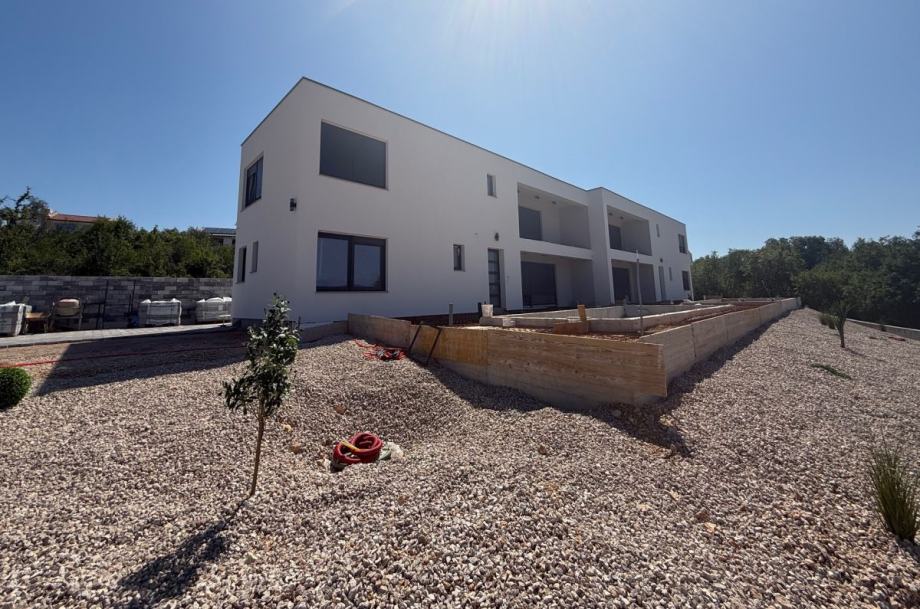 Otok Krk, grad Krk, šire područje, prodaja nove dvojne vile površine 157,48 m2, s bazenom i uređenom okućnicom, na atraktivnoj lokaciji, na rubu zelene zone. Vila se sastoji od prizemlja s dnevnom sobom, kuhinjom, blagovaonom, jednom spavaćom sobom, kupaonicom, hodnikom, toaletom, vešerajem, saunom te loggiom i prvog kata s tri spavaće sobe s vlastitim kupaonicama, hodnikom i loggiom. Kvalitetna gradnja i oprema, klimatizacija, podno grijanje, dva parkirna mjesta. Udaljenost od mora 750 m.