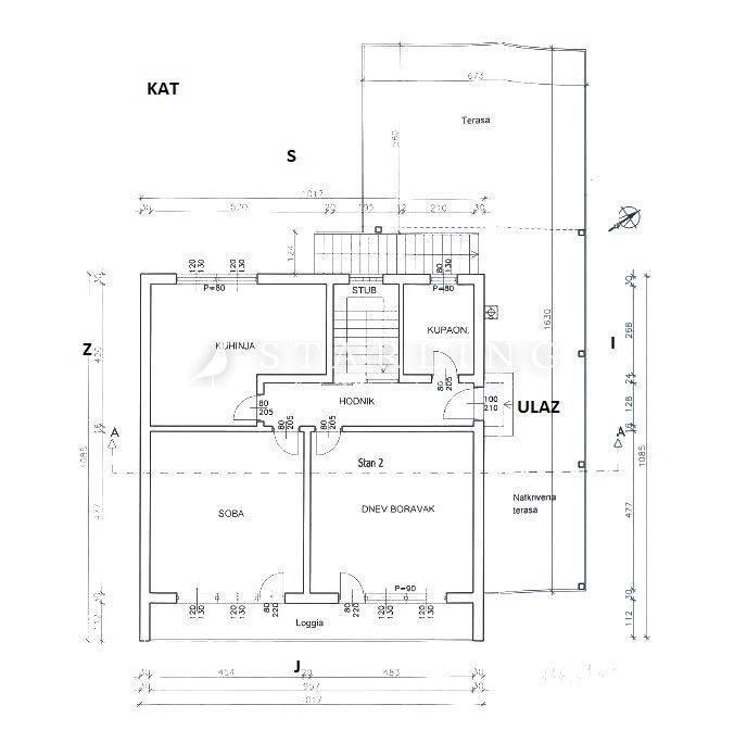 KAT: kuhinja s blagovaonom, spavaća soba, kupaonica, ulazni hodnik i natkrivena terasa.