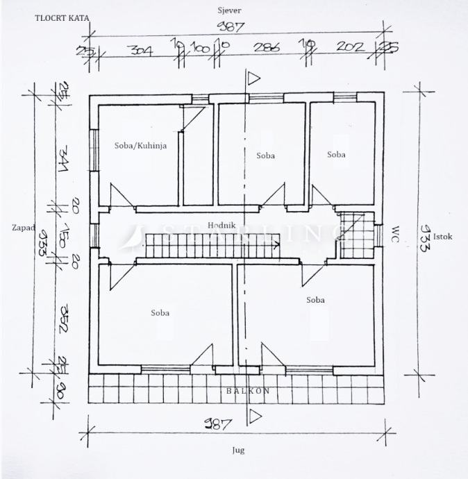 Kat (79 m2) se sastoji od pet prostorija (ovisno o potrebama, sve prostorije mogu biti sobe, a potencijalno se može urediti i kuhinja), samostalnog WC-a, hodnika i balkona.