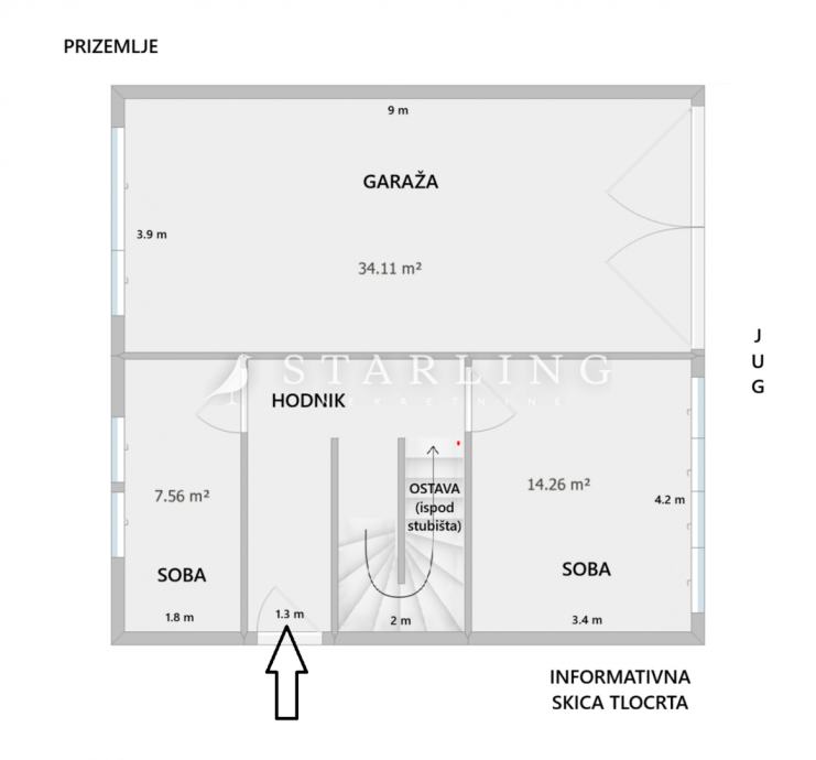- PRIZEMLJA: dvije sobe, hodnik, garaža i stubište