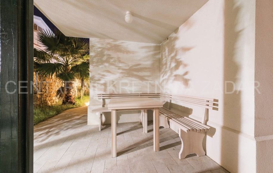 Uz kuću je ljetna kuhinja s toaletom i prostorom za zabavu od 70 m² (biljar, pikado, stolni nogomet). Pred kućom je bazen od 49 m² i vanjski tuš. Uz kuću su četiri natkrivena parkirna mjesta. Parcela od 520 m² ograđena je kamenim zidom, a dvorište popločano kamenom i uređeno raznovrsnim mediteranskim biljem i palmama.