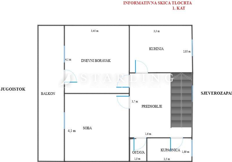 PRVI KAT: dnevni boravka iz kojeg se izlazi na balkon, kuhinja, spavaća soba, kupaonica, ostava i predsoblje