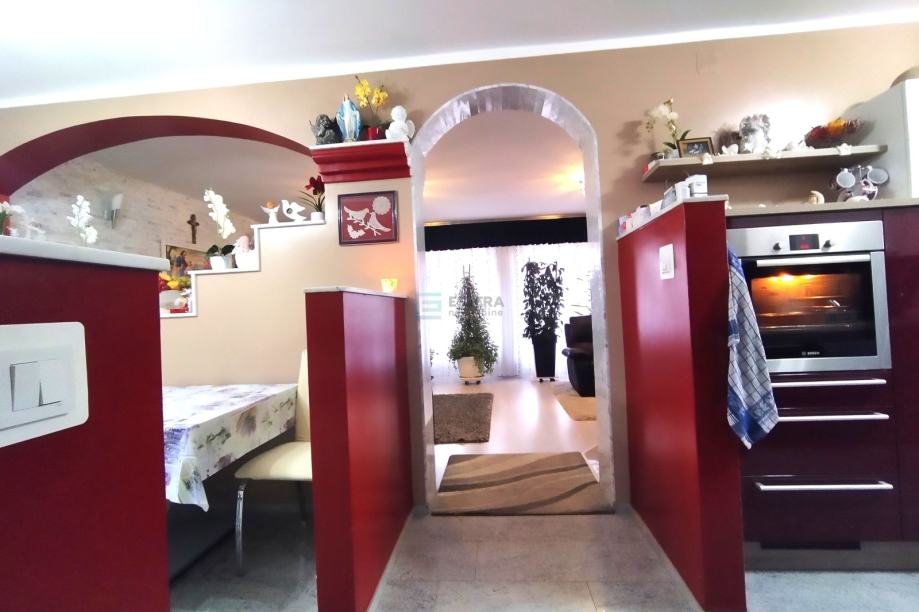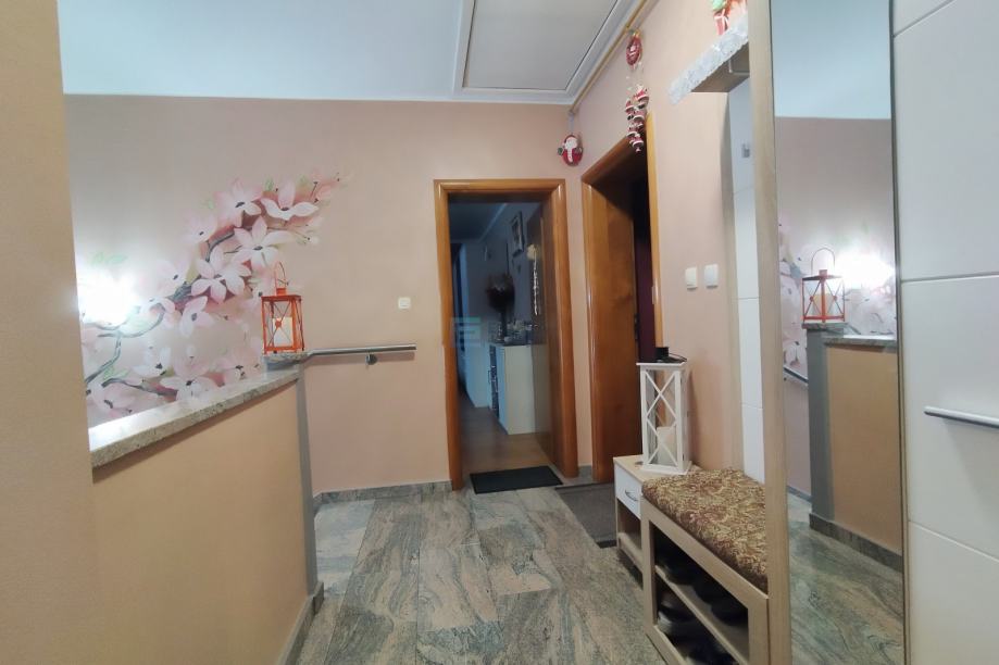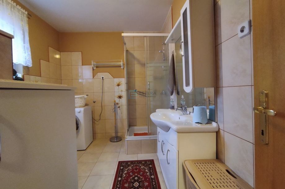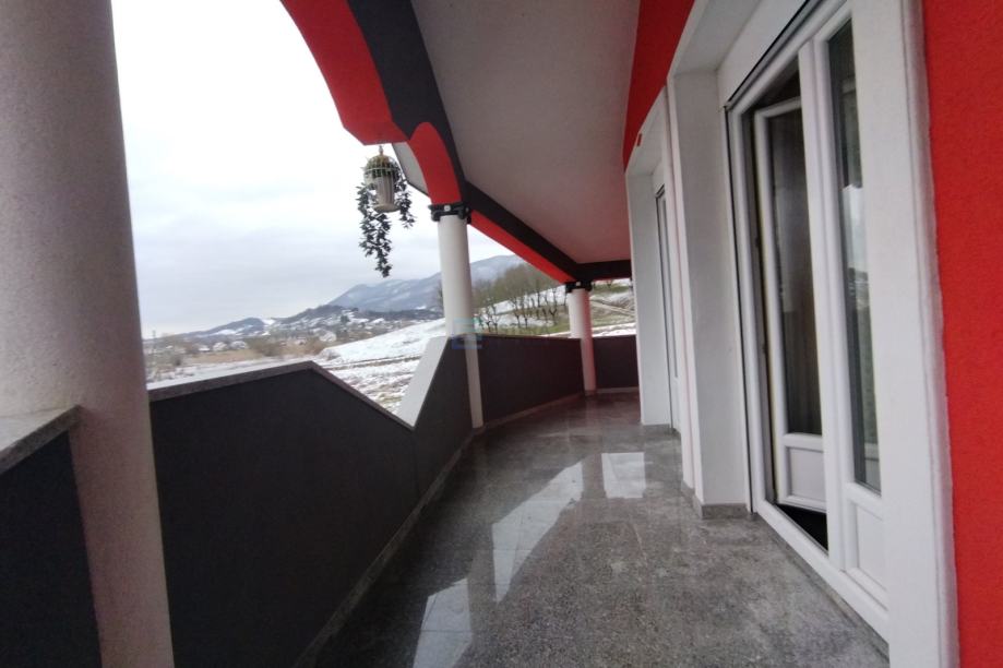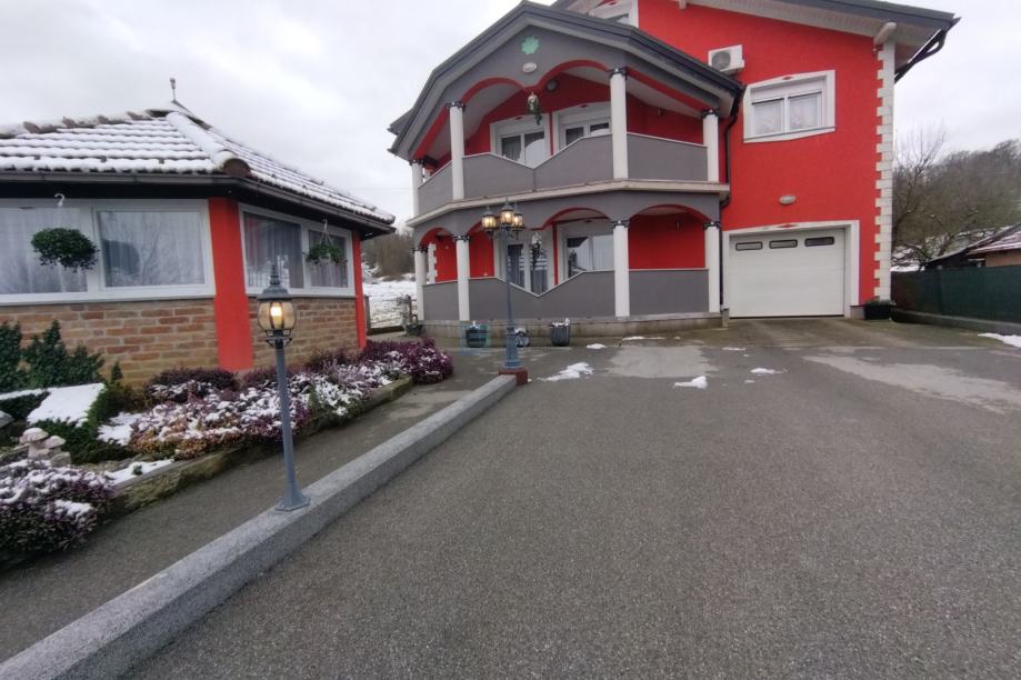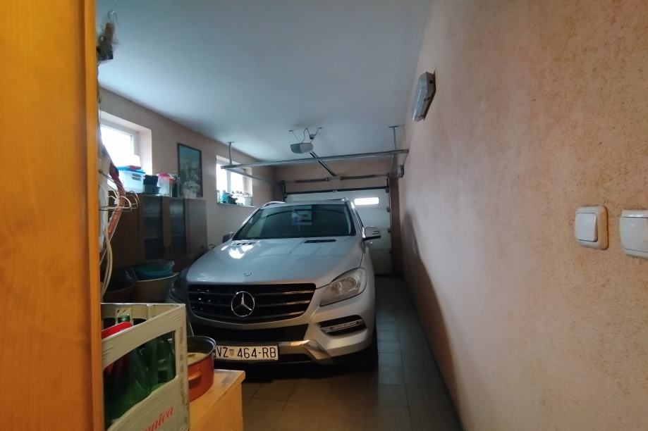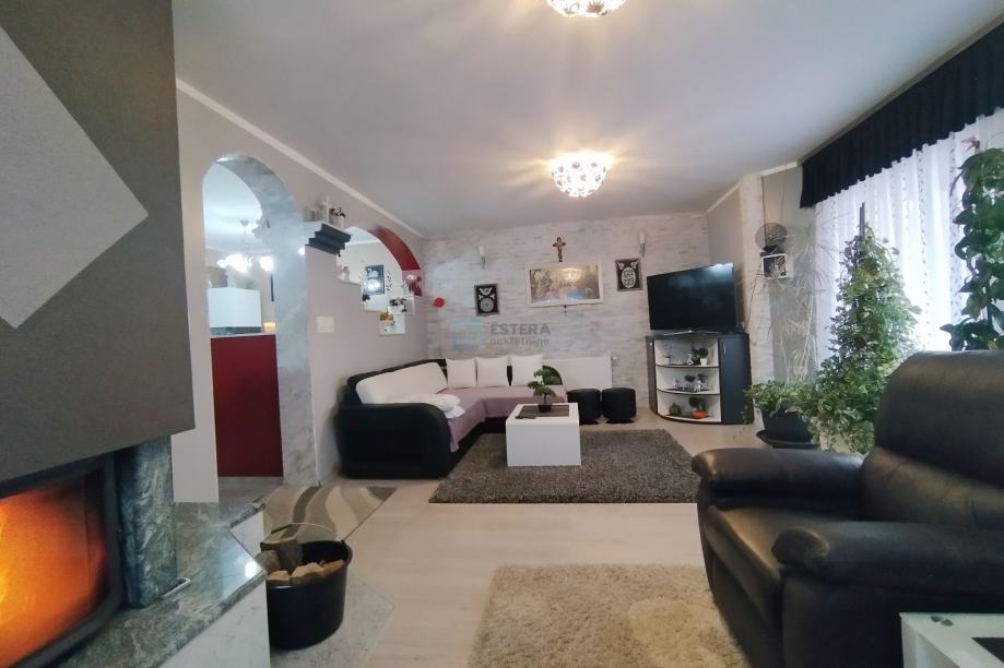 PRVI KAT kuće sastoji se od: stepeništa, hodnika, wc, kupaonice sa wc-om, spavaće sobe 1, spavaće sobe 2, sobe za rekreaciju, čajne kuhinje s blagovaonom, radnom sobom i dnevnim boravkom sa izlazom na terasu. Kuća je vrlo kvalitetno izgrađena sa termo izolacijom (10 cm), svih zidova, tavana i podova (podno grijanje). Centralno etažno plinsko grijanje (kondenzacijski bojler), sa mogućnosti grijanja putem dva velika kamina na kruto gorivo (prizemlje i kat), vanjska PVC stolarija, unutarnja drvena sa futer štokovima koji nisu samo dekorativni dodatak već i dodatni zvučni i toplinski izolator. Ručno izrađeni zidovi od kamena, podovi od kamena, laminat, keramika. Četiri klima uređaja sa opcijama grijanja i hlađenja. U sklopu kuće nalazi se prostrana garaža (ulaz s unutarnje i vanjske strane kuće). Uz uređenu i ograđenu okućnicu nalazi se sjenica s roštiljem namjenjena za obiteljska druženja.