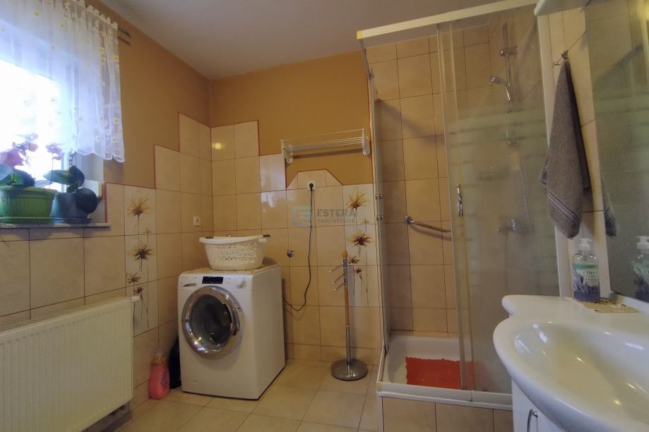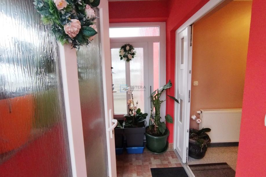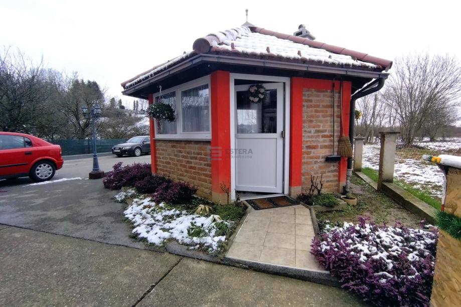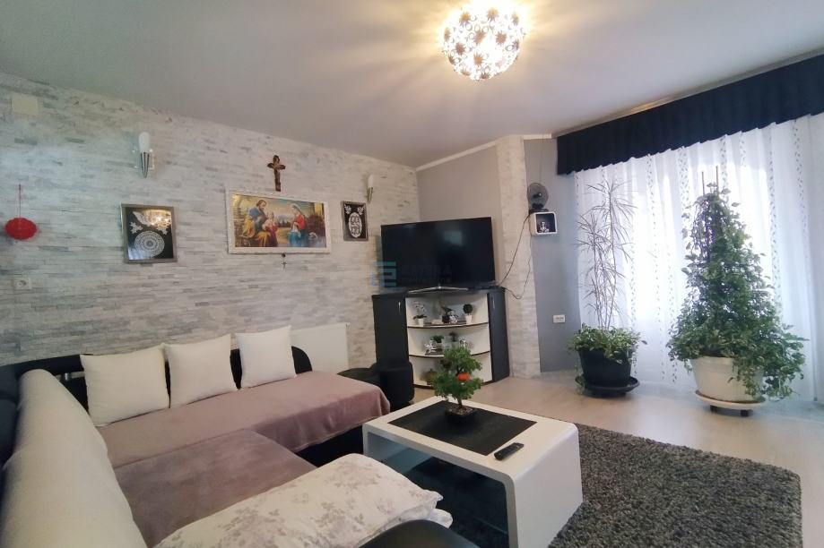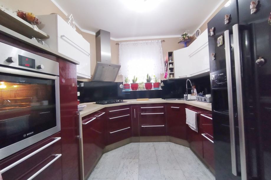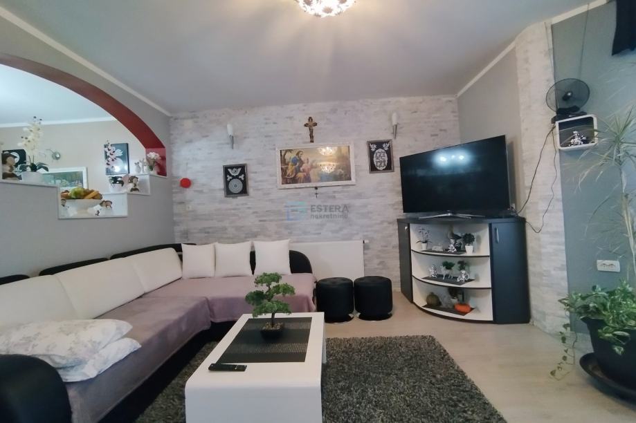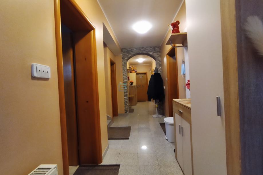 PRVI KAT kuće sastoji se od: stepeništa, hodnika, wc, kupaonice sa wc-om, spavaće sobe 1, spavaće sobe 2, sobe za rekreaciju, čajne kuhinje s blagovaonom, radnom sobom i dnevnim boravkom sa izlazom na terasu. Kuća je vrlo kvalitetno izgrađena sa termo izolacijom (10 cm), svih zidova, tavana i podova (podno grijanje). Centralno etažno plinsko grijanje (kondenzacijski bojler), sa mogućnosti grijanja putem dva velika kamina na kruto gorivo (prizemlje i kat), vanjska PVC stolarija, unutarnja drvena sa futer štokovima koji nisu samo dekorativni dodatak već i dodatni zvučni i toplinski izolator. Ručno izrađeni zidovi od kamena, podovi od kamena, laminat, keramika. Četiri klima uređaja sa opcijama grijanja i hlađenja. U sklopu kuće nalazi se prostrana garaža (ulaz s unutarnje i vanjske strane kuće). Uz uređenu i ograđenu okućnicu nalazi se sjenica s roštiljem namjenjena za obiteljska druženja.