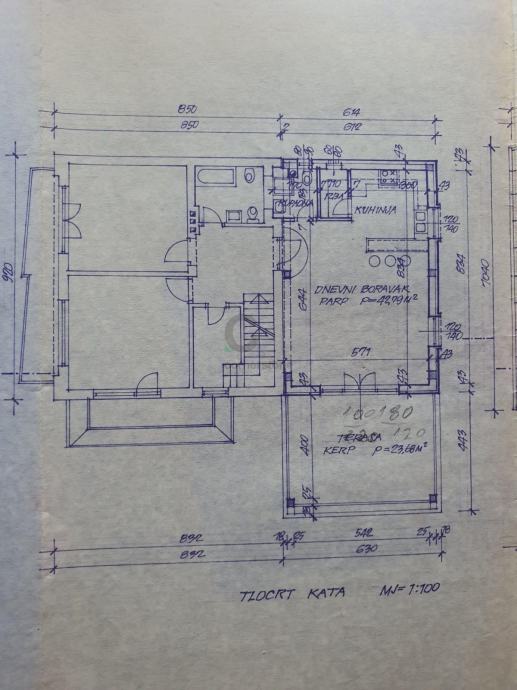 Etaža prvog kata sastoji se od dvije kupaonice, dvije spavaće sobe koje imaju izlaze na balkon, kuhinje i prostranog dnevnog boravkas izlazom na zatvorenu terasu.