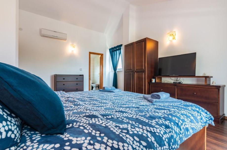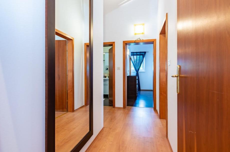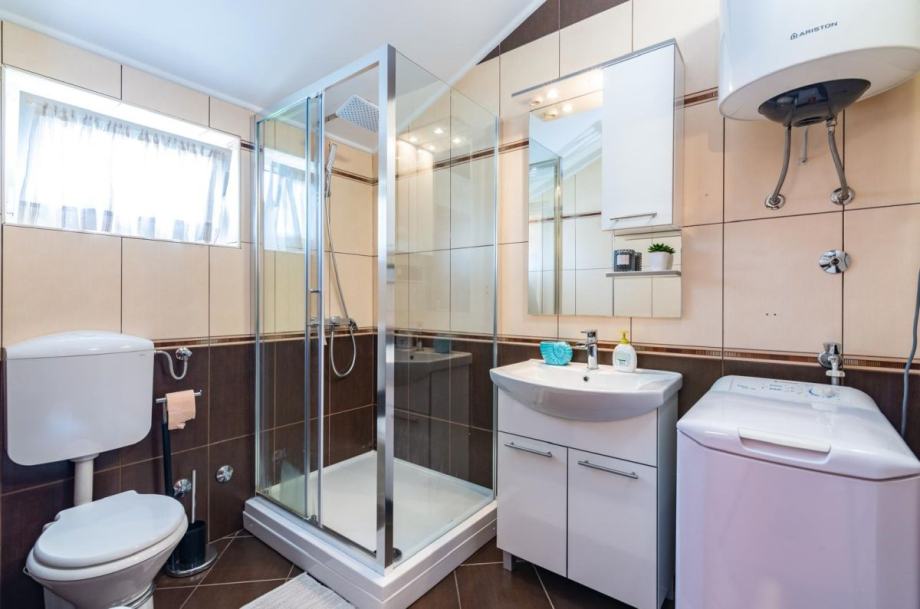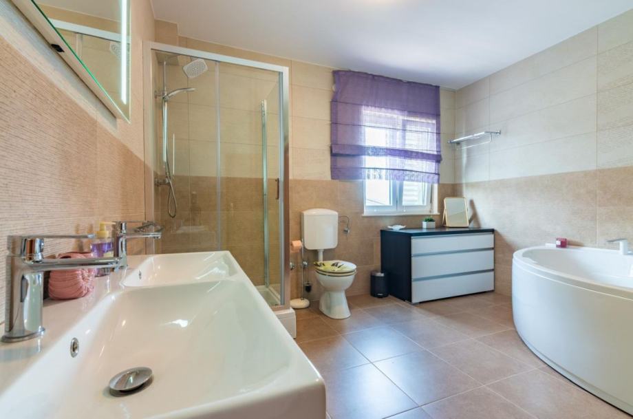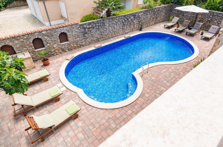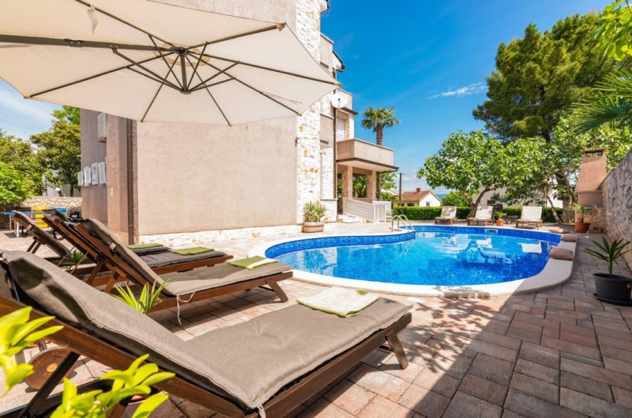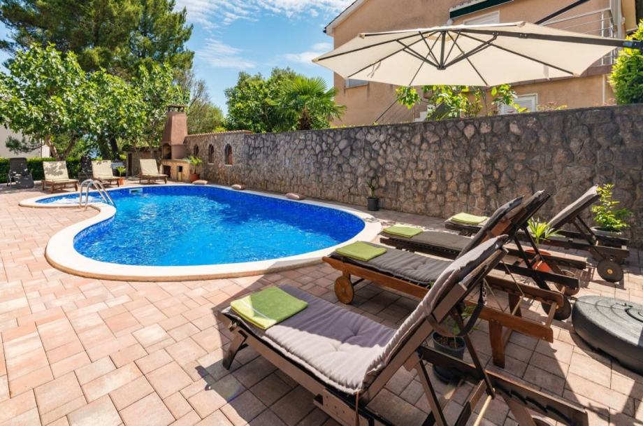 Otok Krk, Malinska, šire područje, prodaja samostojeće kuće površine 255,48 m2, s bazenom površine 43 m2 i prostranom okućnicom, 100 m od mora. Kuća se sastoji od podruma, prizemlja s dnevnom sobom, kuhinjom, blagovaonom, kupaonicom, ostavom, hodnikom i natkrivenom terasom površine 39 m2, prvog kata s dvije spavaće sobe s vlastitim kupaonicama i terasom površine 41 m2 te potkrovlja s master spavaćom sobom s vlastitom kupaonicom, dvije spavaće sobe, kupaonicom, hodnikom i terasom. Kvalitetna gradnja i oprema, klimatizacija, više parkirnih mjesta.