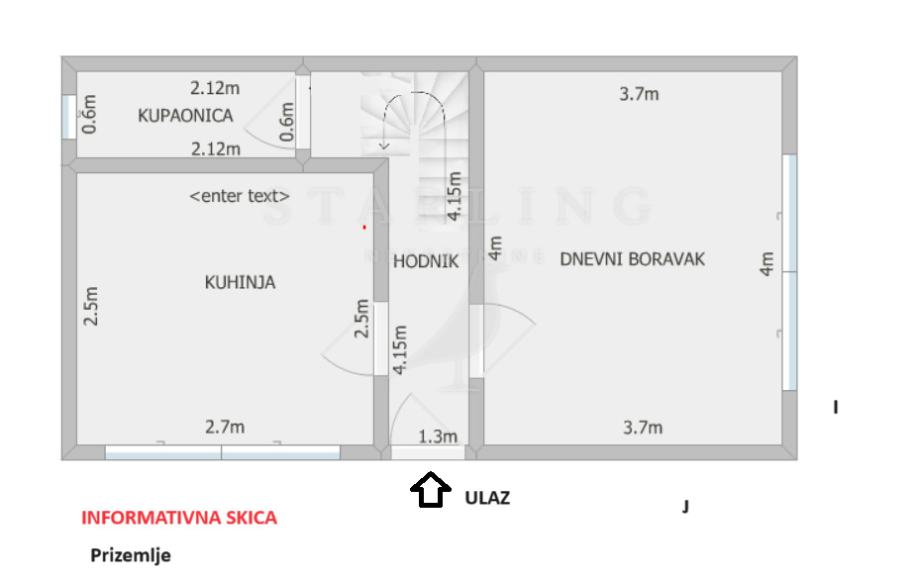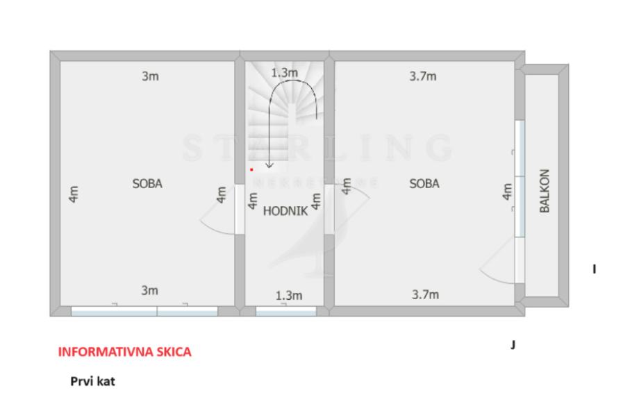Kuća tlocrtno ima 40 m2 a se sastoji od prizemlja, prvog kata i tavana. U prizemlju se nalaze dnevni boravak, kuhinja, kupaonica i hodnik, a na katu se nalaze dvije spavaće sobe i balkon dok je tavan u roh bau stanju kojem pripada balkon.