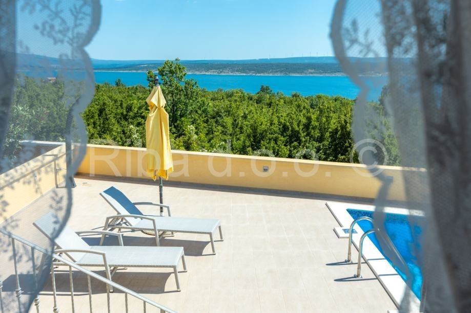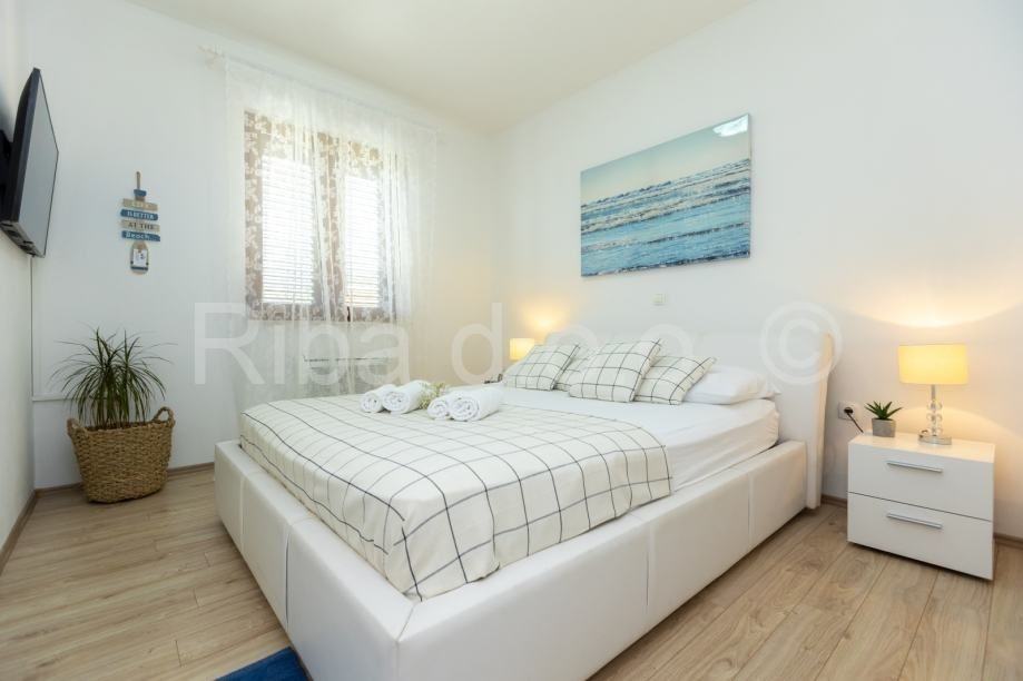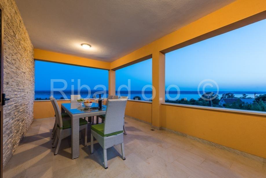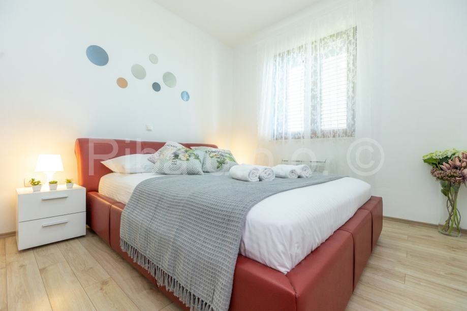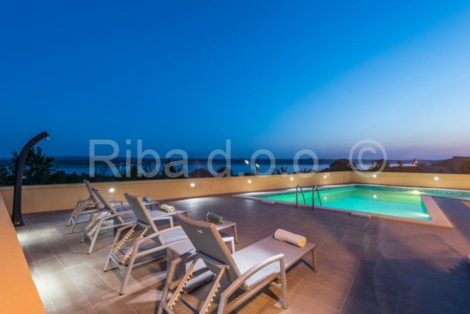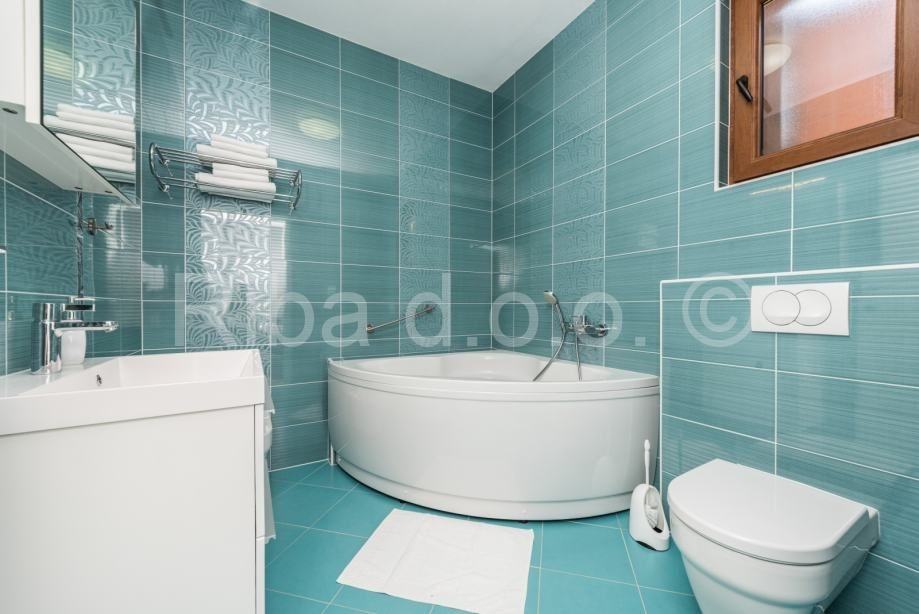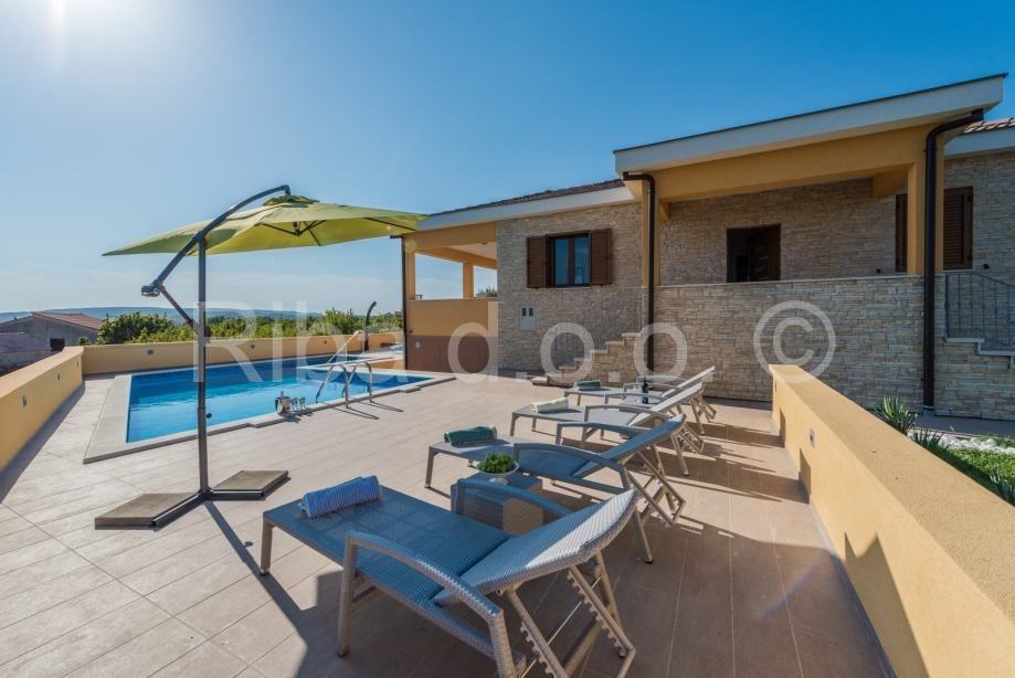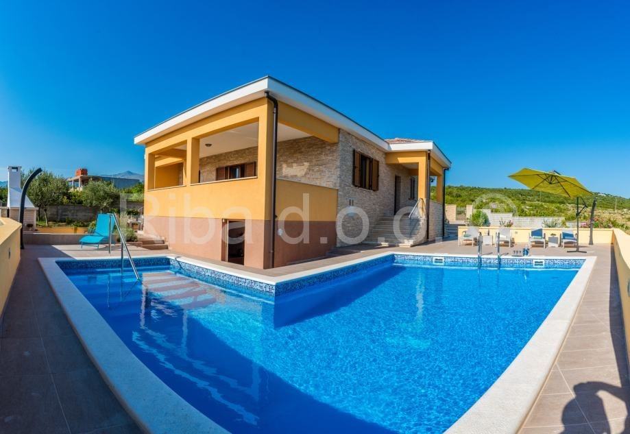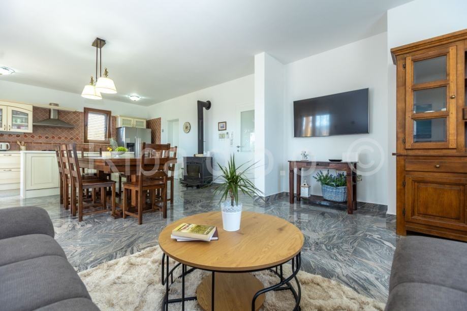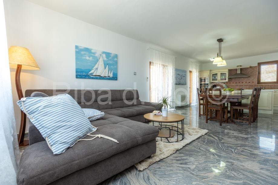 U prizemlju su 3 spavaće sobe, 2 kupaonice, kuhinja i dnevni boravak s izlaskom na terasu, te spremište i toalet. Ima uređenu okućnicu te bazen s postrojenjem za filtraciju. Ima vlastitu kotlovnicu.U sklopu okućnice su 3 do 4 parkirna mjesta. Ulaz ima klizna vrata na daljinsko upravljanje.Vila je klimatizirana putem klima uređaja, a ima pripremu za podno grijanje.Kuća se prodaje kompletno namještena i opremljena.