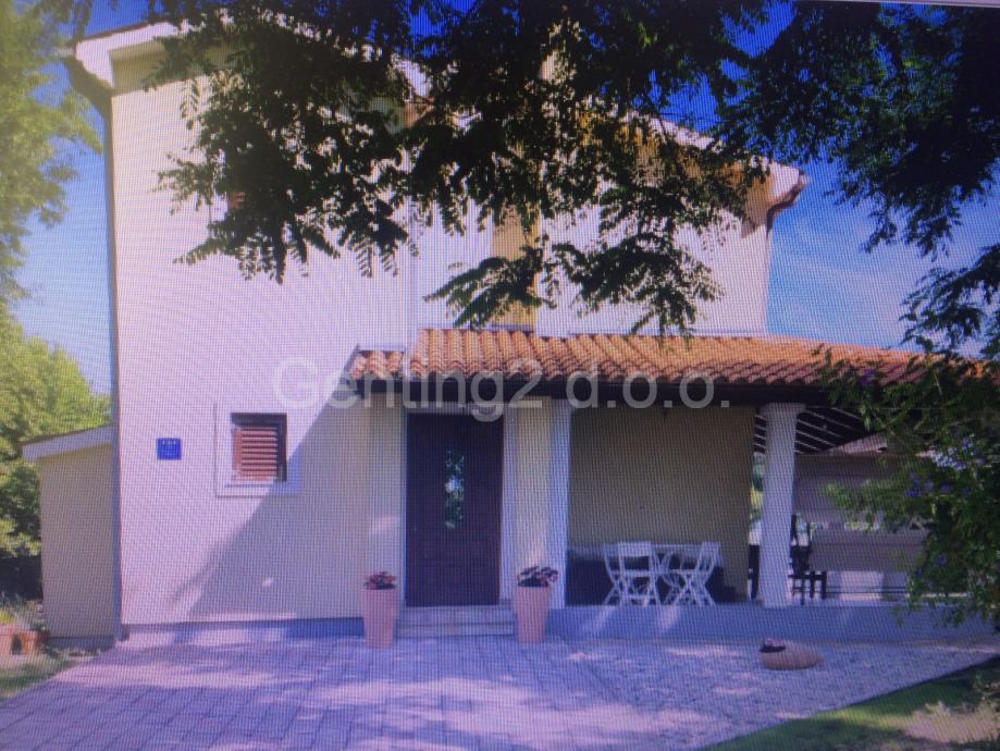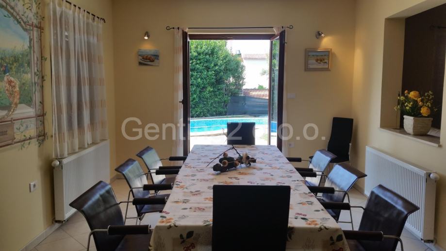 Kuća je u mirnom okruženju na izdvojenoj parceli od 800 m2. Nalazi se na 500m od centra i 600m od mora. Kuća je na kat ukupne površine oko 150m2. U prizemlju je velika kuhinja iz koje se izlazi na terasu i bazen te dnevni boravak sa kaminom koji također ima izlaz na terasu i bazen. U donjem dijelu je i manja kupaonica sa tuš kadom. Drvenim stepenicama se iode na gornji kat gdje su tri sobe i velika kupaonica sa hidromasažnom kadom. Iz dvije sobe je izlaz na balkon sa kojeg se pruža pogled na bazen i na more. Kuća je klimatizirana, a po zimi postoji mogućnost centralnog grijanja.