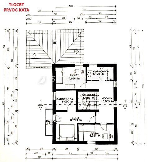 PRVI KAT (površine 74 m2): tri spavaće sobe, walk-in garderoba, kupaonica s WC-om, hodnik i balkon.