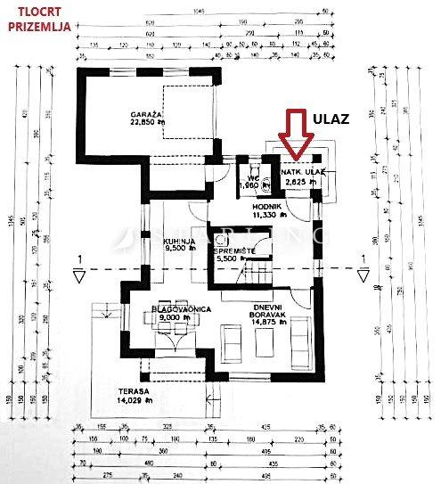 PRIZEMLJE (površine 96 m2): natkriveni ulaz, dnevni boravak s blagovaonicom i kuhinjom, hodnik, WC, ostava i garaža.