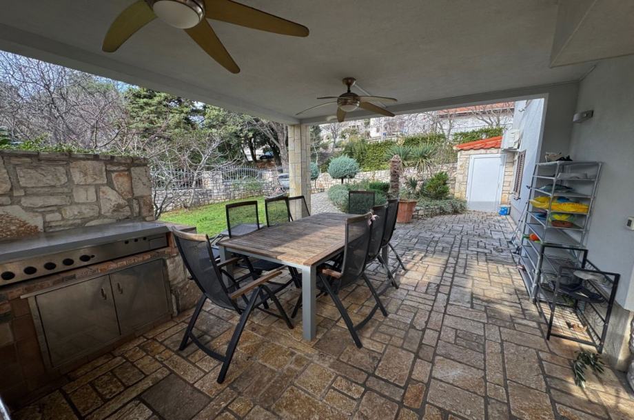 Otok Krk, Omišalj, prodaja samostojeće kuće površine 167 m2, s okućnicom površine 460 m2 i djelomičnim pogledom na more, na atraktivnoj lokaciji, 100 m od plaže. Kuća se sastoji od prizemlja i kata s dva odvojena trosobna apartmana s terasama površine 15 m2. Kvalitetna gradnja, PVC stolarija, klimatizacija, ljetna kuhinja, spremište, četiri parkirna mjesta.