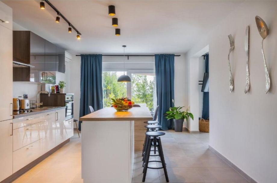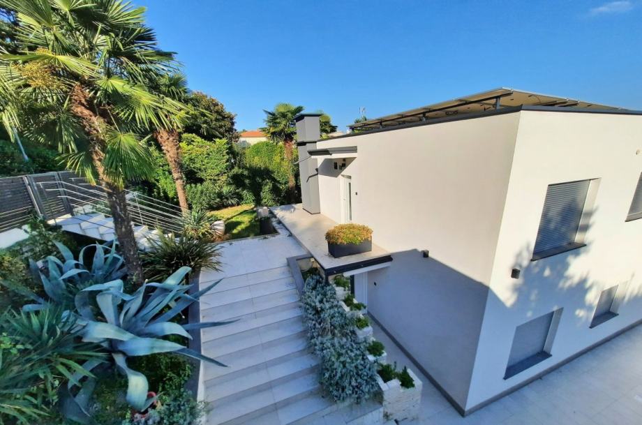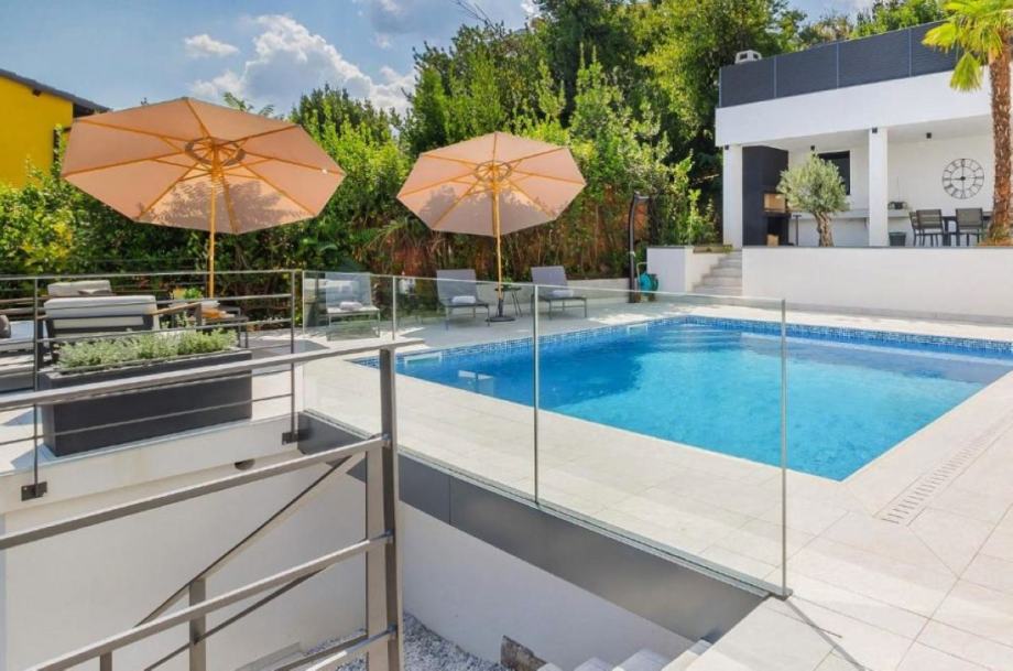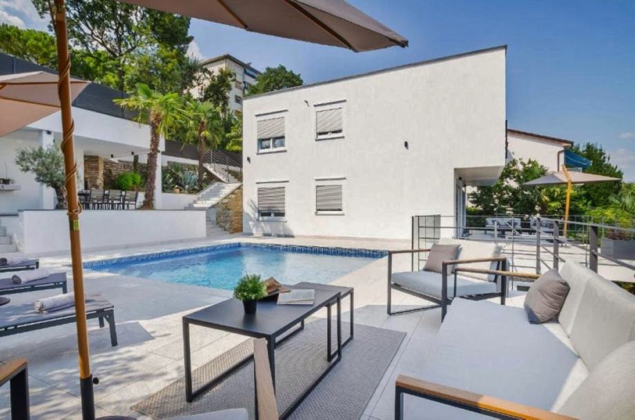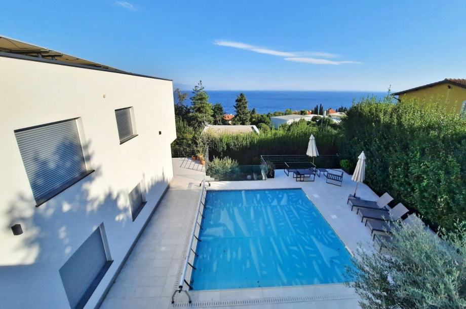 Opatija,Volosko, prodaja luksuzne vile površine 150 m2, s bazenom i pogledom na more, na mirnoj lokaciji, 950 m od plaže i centra Opatije. Vila se sastoji od prizemlja s dnevnom sobom, kuhinjom, blagovaonom, spavaćom sobom, kupaonicom, toaletom, stepeništem, kotlovnicom i terasom te prvog kata s tri spavaće sobe, dvije kupaonice i balkonom. Visokokvalitetna gradnja i oprema, vrhunska keramika i sanitarije, klimatizacija, podno grijanje, vanjska kuhinja, vanjski pomoćni objekt, wellness, grijani bazen, dva parkirna mjesta.