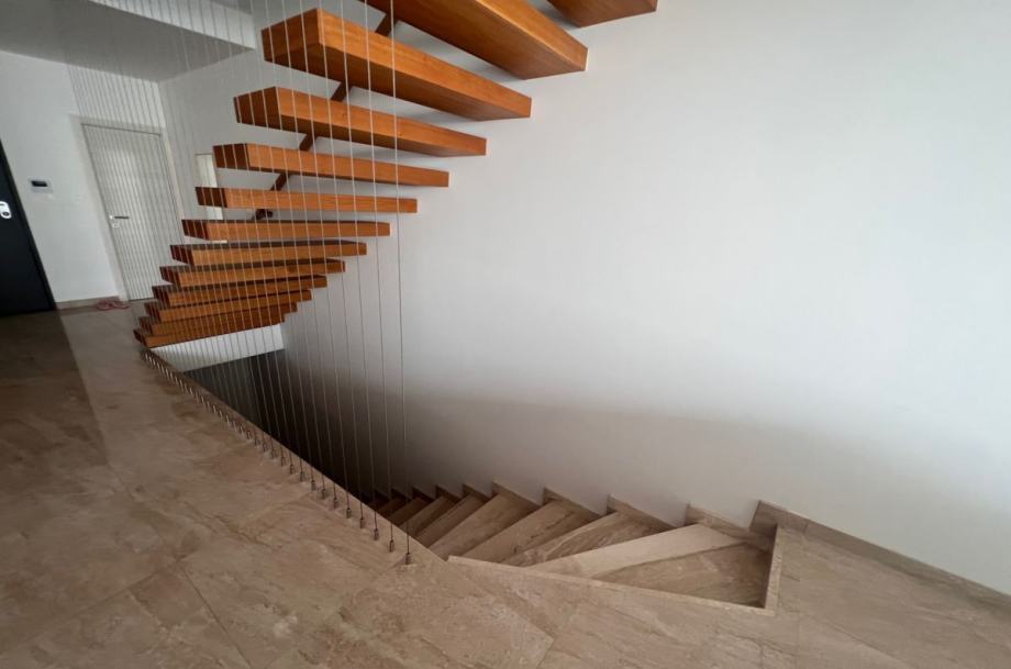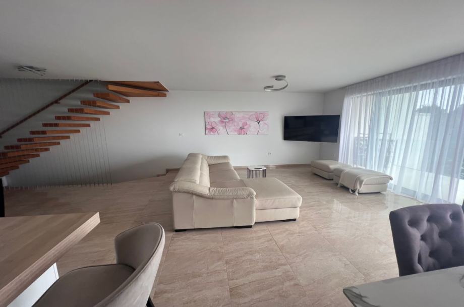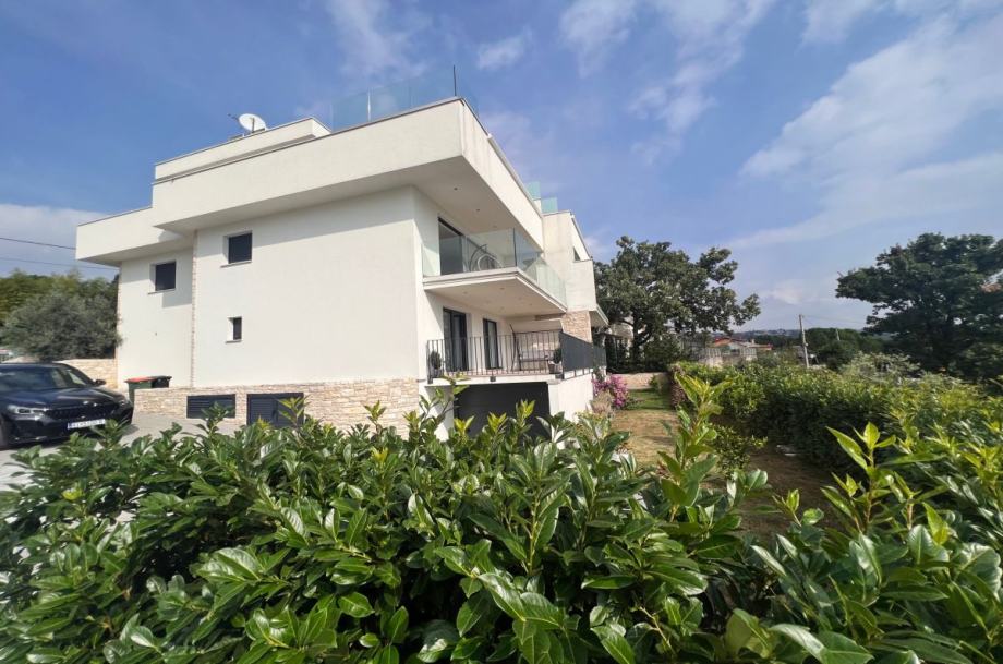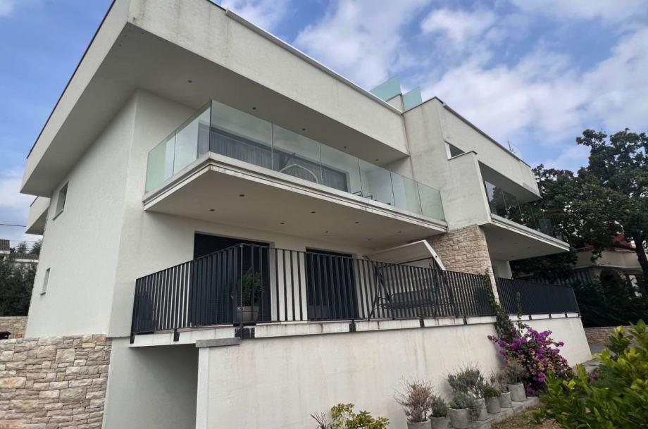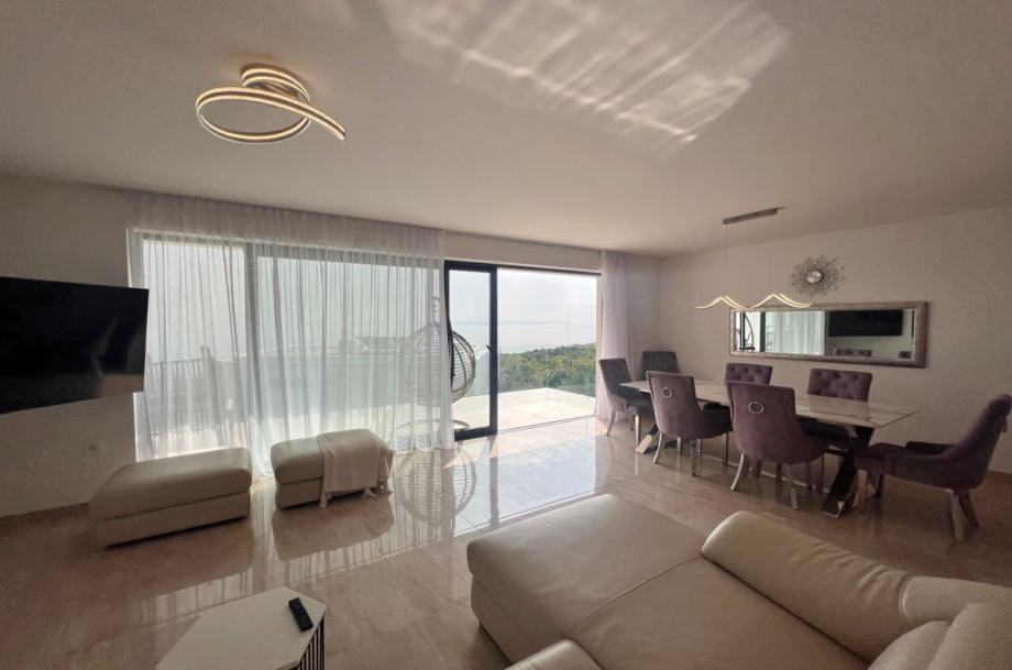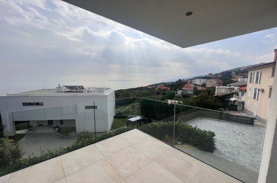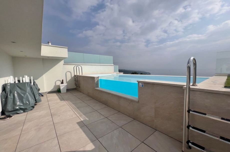 Opatija, Pobri, prodaja atraktivne dvojne kuće površine 250 m2, s krovnim bazenom, panoramskim pogledom na more i uređenom okućnicom površine 250 m2, na mirnoj lokaciji, 2000 m od mora. Kuća se sastoji od podruma s garažom, spremištem, teretanom i sobom za druženje, prizemlja s dvije spavaće sobe s vlastitim kupaonicama i natkrivenom terasom, prvog kata s dnevnom sobom, kuhinjom, blagovaonom, spavaćom sobom, kupaonicom i natkrivenom terasom te drugog kata sa spavaćom sobom, kupaonicom, terasom i bazenom. Kvalitetna gradnja i oprema, klimatizacija, četiri parkirna mjesta.