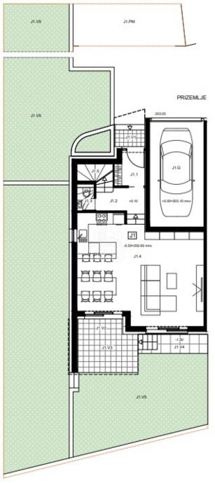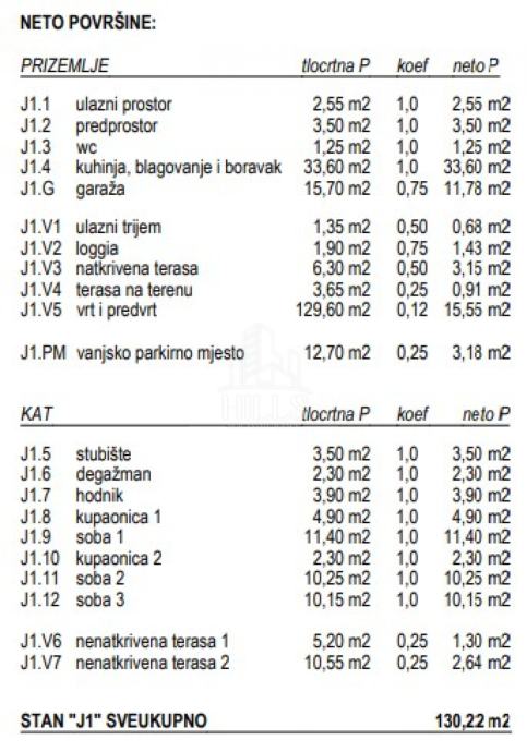 Prizemlje: dnevni boravak, kuhinja, blagovaonica, wc, ulazni prostor, predprostor, stubište, lođa i terasa.