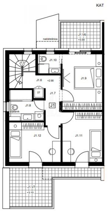 Kat: 3 spavaće sobe, 2 kupaonice, hodnik, degažman, stubište i 2 terase