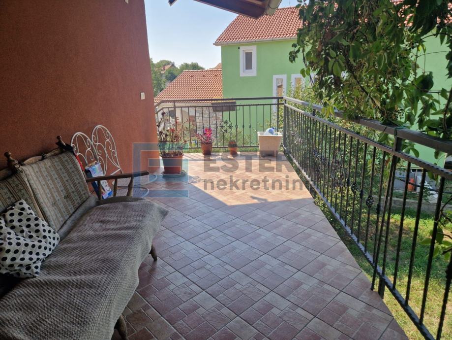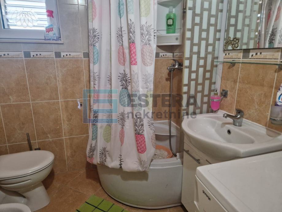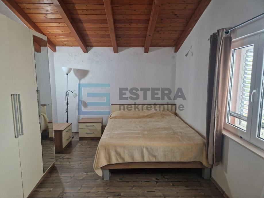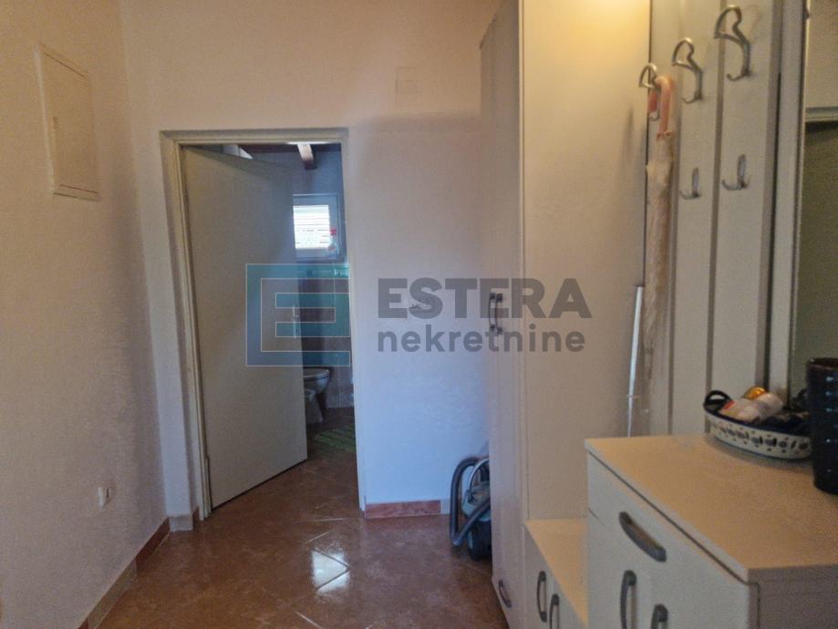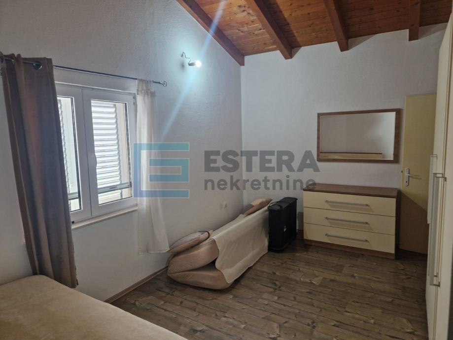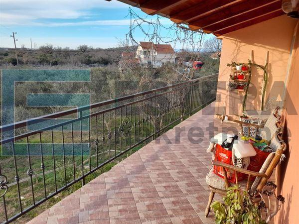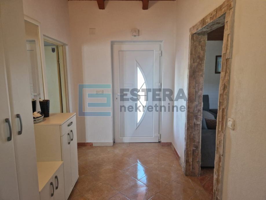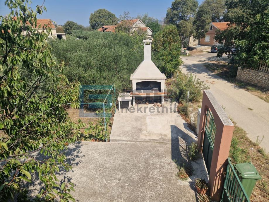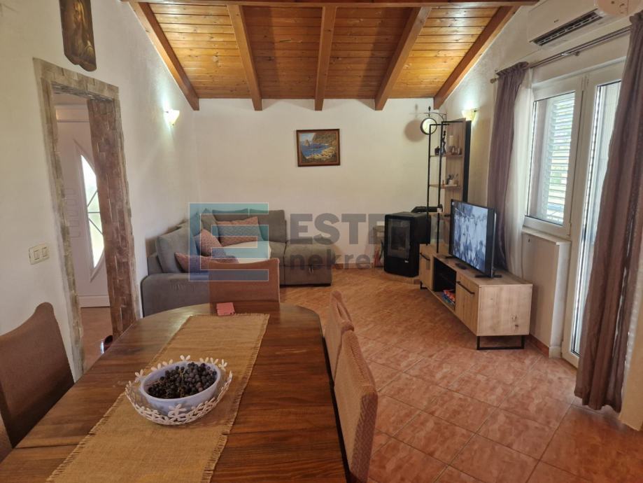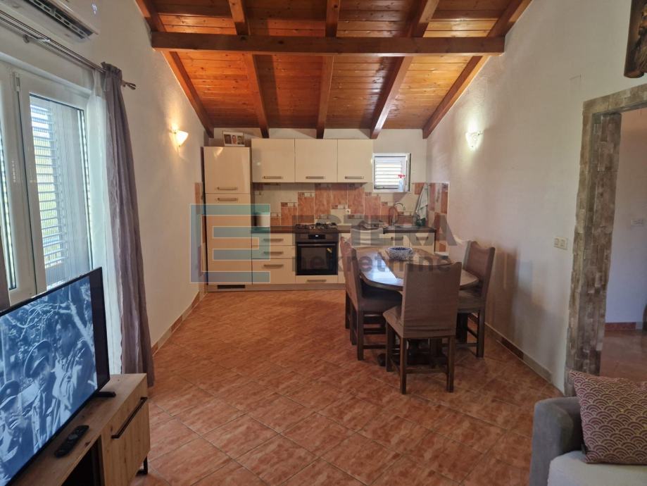 Kuća se sastoji od prizemlja u kojem su garaža i spremište, te kata na kojemu se nalazi potpuno namješten dvosobni stan sa terasom. Na parceli se nalazi maslinik, a u kući su uvedeni struja i voda.