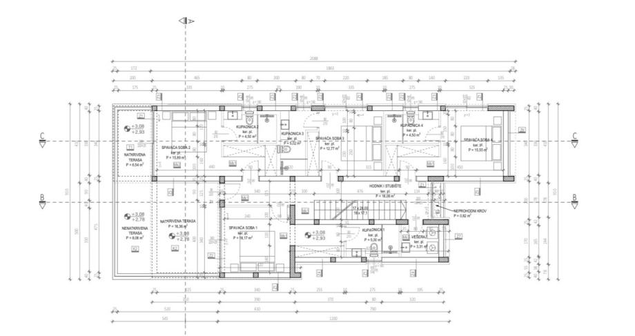 Kuća se prostire na parceli od 560 m2 , od kojih čini sama nekretnina 360 m2.
