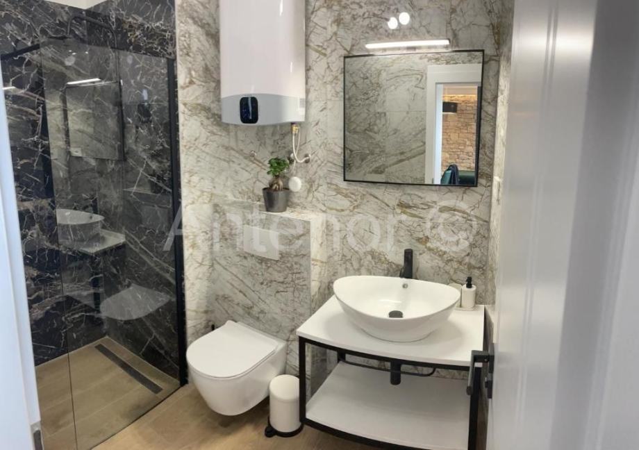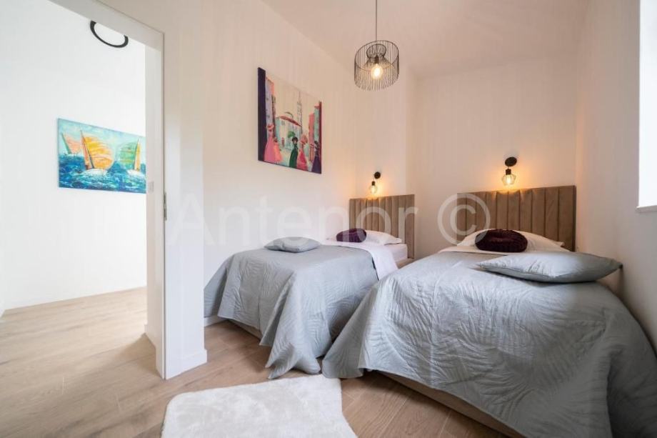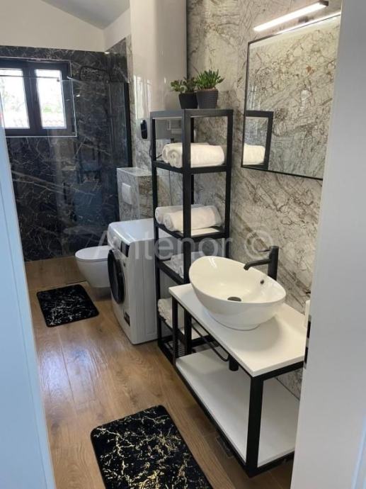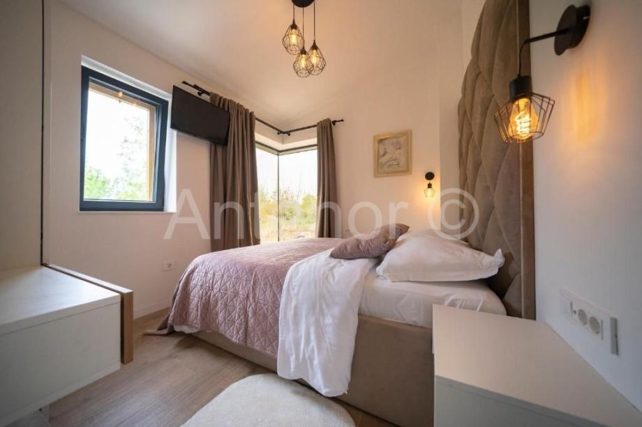 Vila se sastoji od prizemlja i kata. U prizemlju se nalazi potpuno opremljena kuhinja, blagavaona, dnevni boravak i kupaonica, a na katu se nalaze dvije spavaće sobe. U dvorištu se nalazi grijani bazen, vanjski tuš, parkiralište. Kuća ima podno grijanje i klima uređaj.
