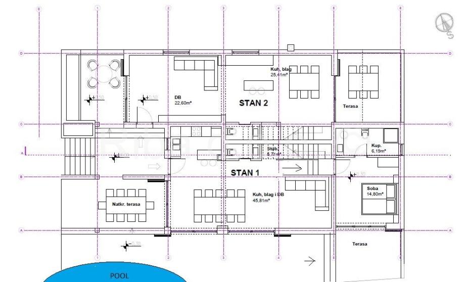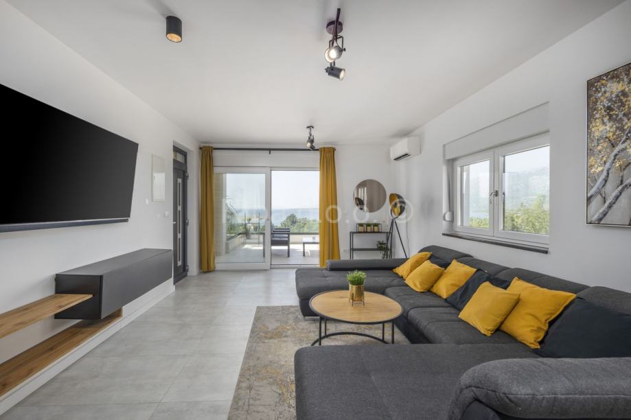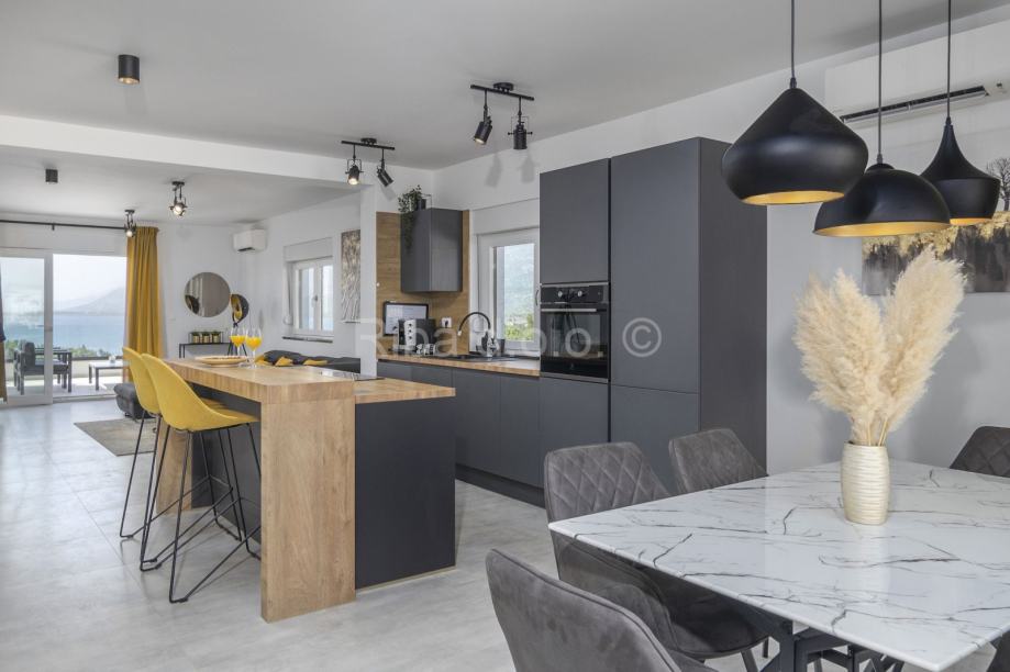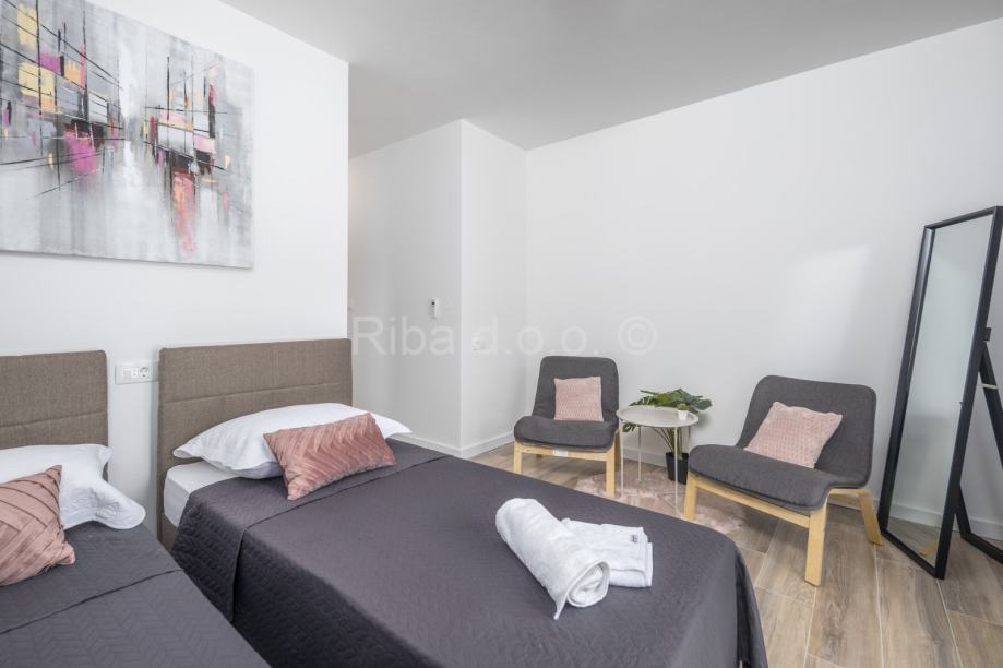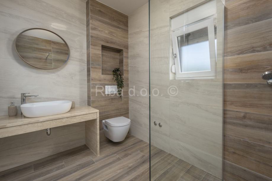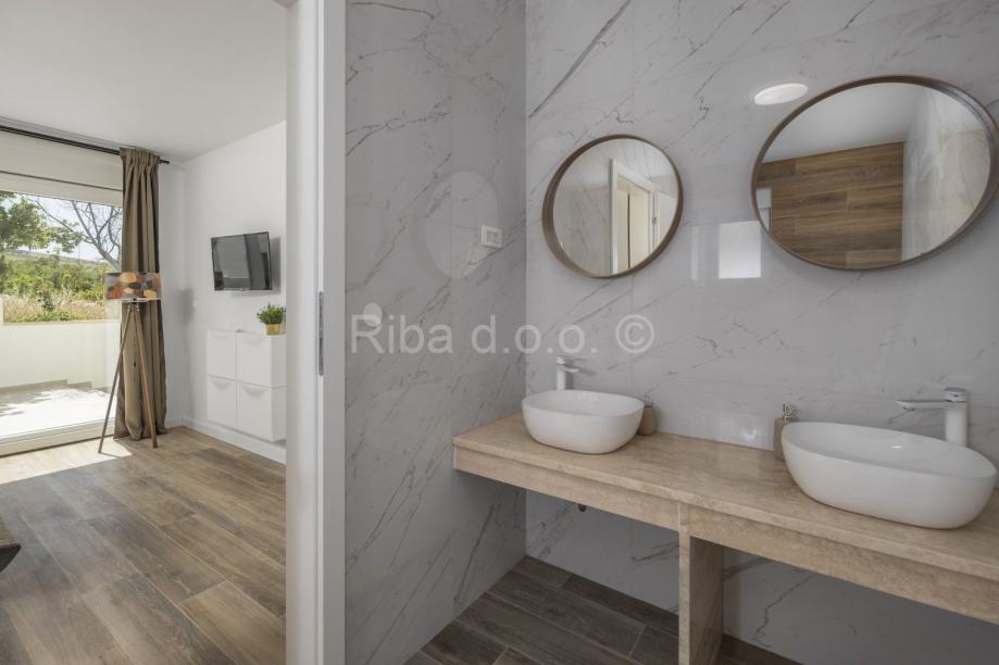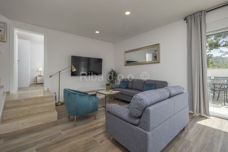 U prizemlju većeg stana je dnevni prostorsa izlaskom na terasu, vrt i bazen. Tu je još kuhinja, blagovaonica, wc, spremište te jedna spavaća soba s kupaonicom i terasom. Na katu je još jedno spremište i tri spavaće sobe, svaka sa svojom kupaonicom i terasom.