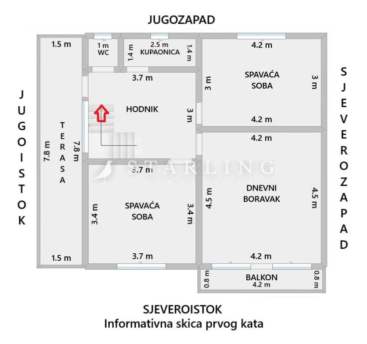 U ukupnu kvadraturu nije uračunat tavanski prostor tlocrtne površine cca 60 m2 (djelomični rohbau).