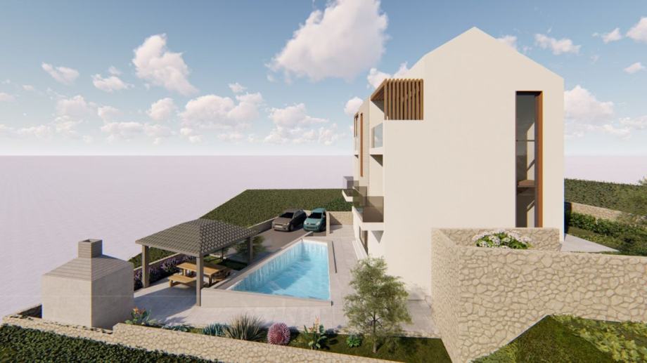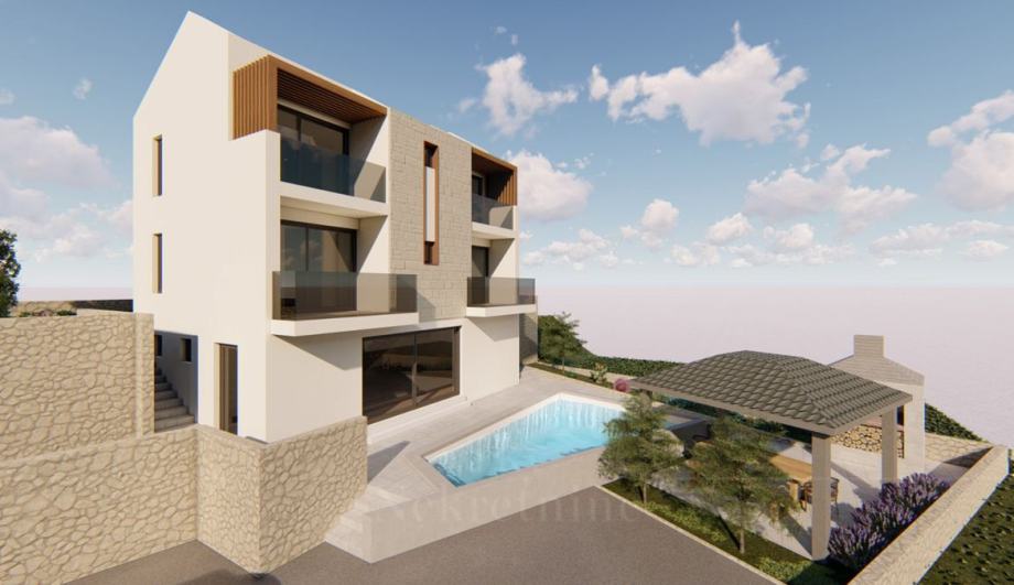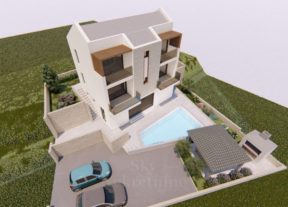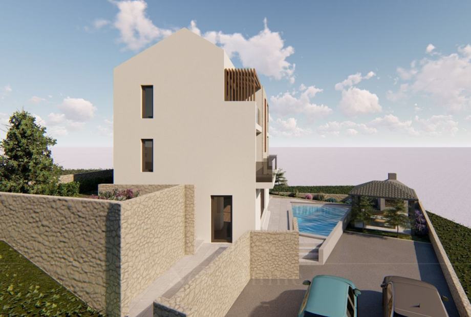 Koncept vile kreiran je da sadrži elemente klasične mediteranske vile kao što su kameni zidovi i fasadni elementi u kombinaciji s modernim pergolama i staklenim ogradama.