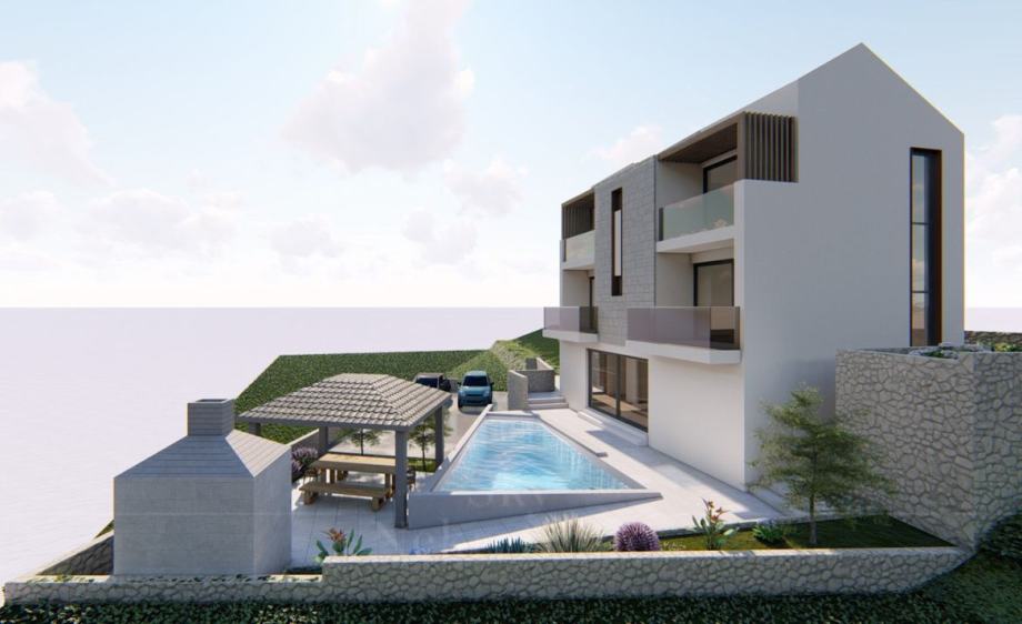 Vila je smještena na uzvišenoj parceli s otvorenim pogledom, svega 70 metara od mora i prve plaže.