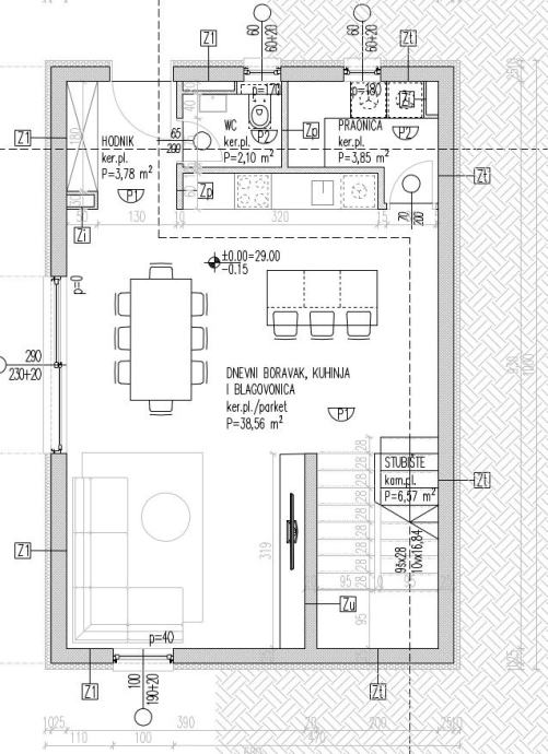- PRIZEMLJE - open space dnevni boravak s blagovaonicom i kuhinjom, hodnik, gostinjski toalet, praonica i izlaz na terasu