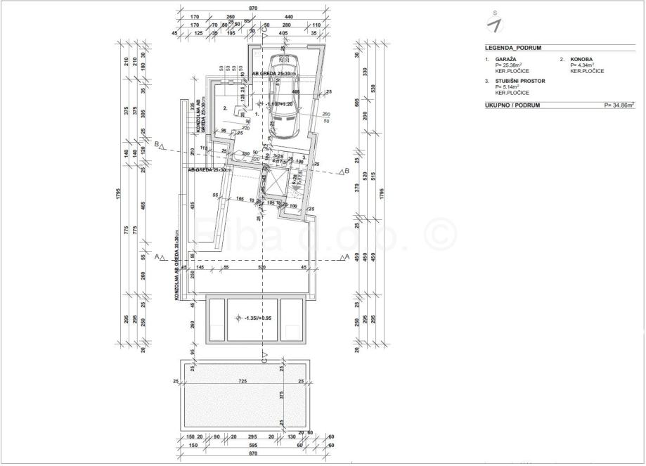 U prizemlju kuće smještenaje praonica rublja, kupaonica, veliki dnevni boravak te kuhinja i blagovaonica iz koje se izlazi na terasu i bazen.