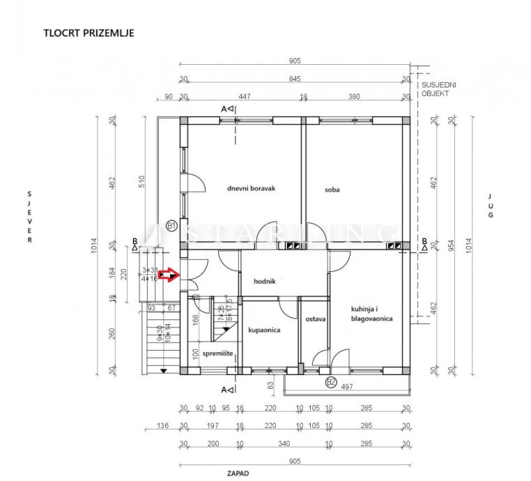 Također moguće ju je adaptirati prema ishođenoj Građevinskoj dozvoli za rekonstrukciju zgrade stambene namjene, 2.b skupine, POLUUGRAĐENA STAMBENA ZGRADA - 3 STANA. Prema Građevinskoj dozvoli predviđena je gradnja tri stambene jedinice, spremišta u podrumu (36 m2) i 6 vanjskih nenatkrivenih parkirnih mjesta.