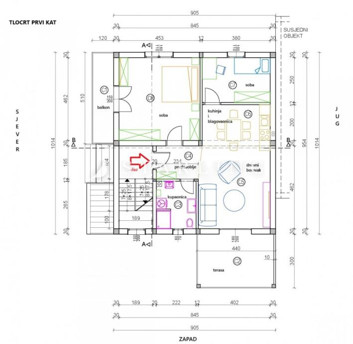 Stan na prvom katu površine 86,83 m2 se sastoji od dnevnog boravka i kuhinje s blagovaonicom, dvije spavaće sobe, kupaonice, predsoblja, balkona, terase i stubišta.