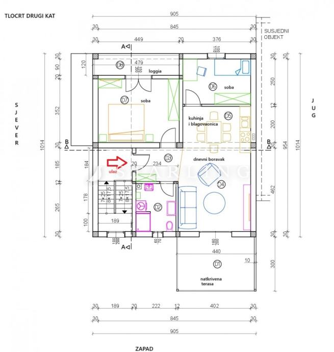 Stan na drugom katu površine 78,45 m2 se sastoji od dnevnog boravka i kuhinje s blagovaonicom, dvije spavaće sobe, kupaonice, predsoblja, loggie, terase i stubišta.