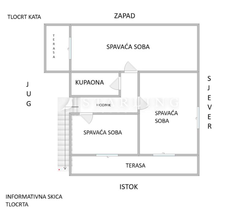 Na prvom katu se nalaze tri spavaće sobe, kupaonica, hodnik i dvije terase.