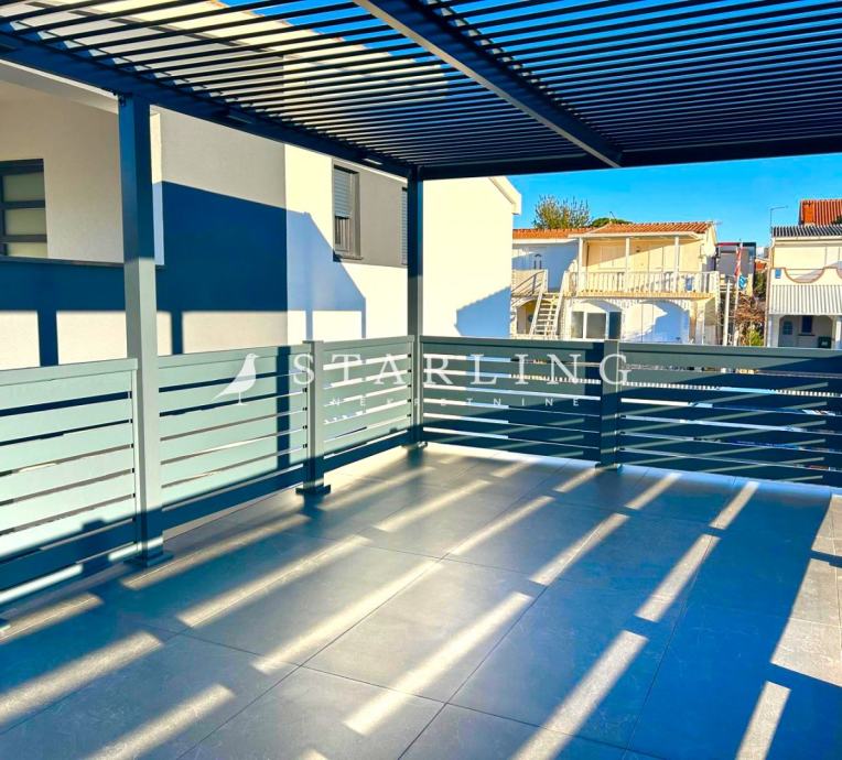 Na prvom katu kuće se nalazi dnevni boravak sa kuhinjom, tri spavaće sobe, kupaonica te prostrana natkrivena terasa površine 13 m2.
