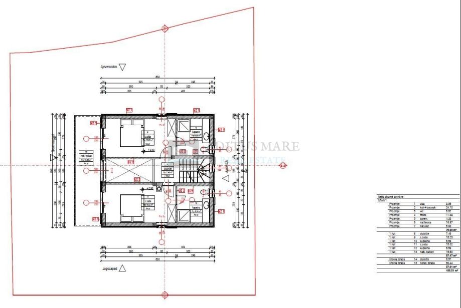Na katu se nalaze 2 spavace sobe u kojima se nalazi wc sa toaletom, te stepenice koje vode na 2 kat, odnosno krovnu nenatkrivenu terasu, s koje se prostire pogled prema moru.