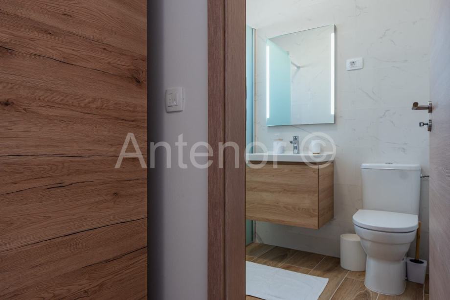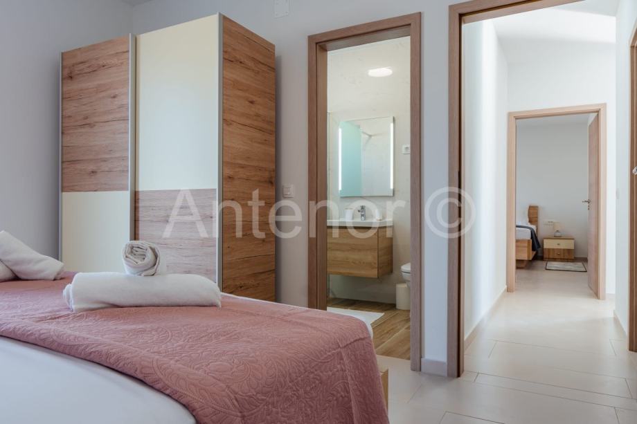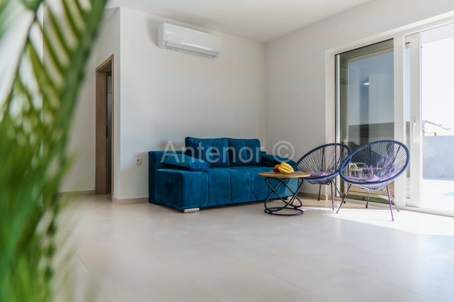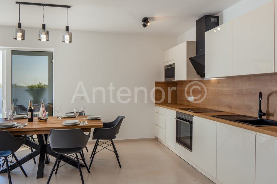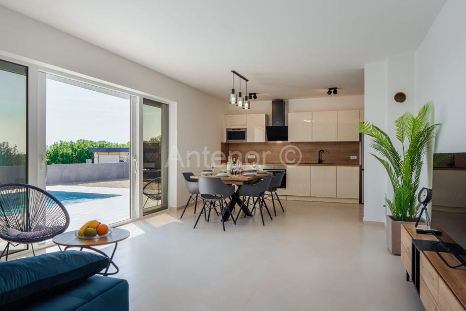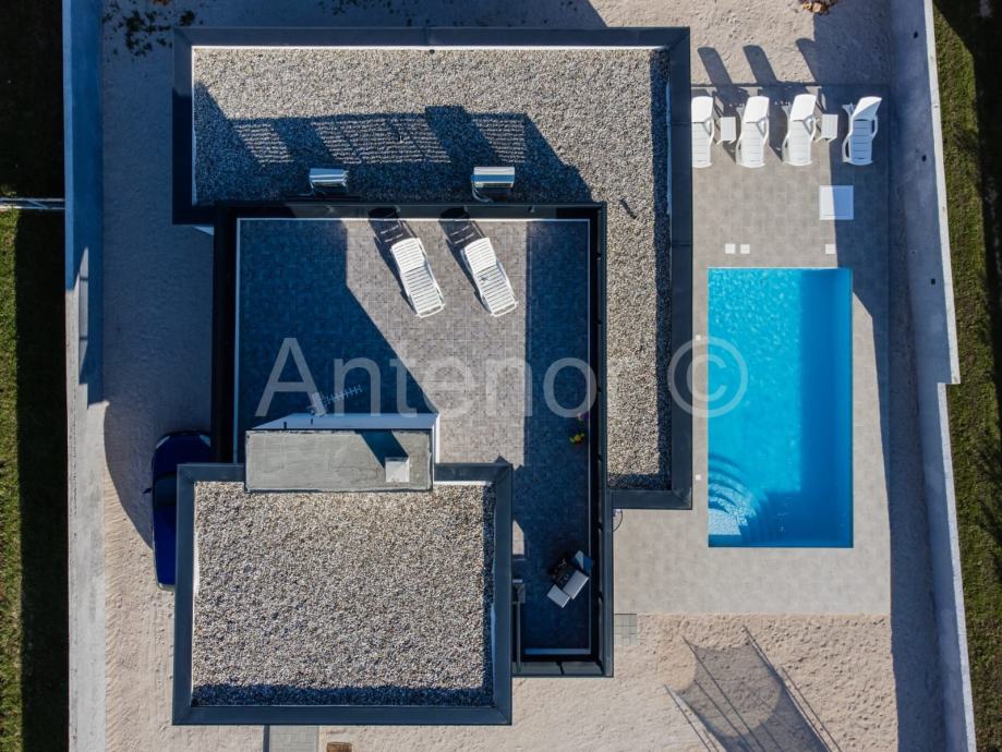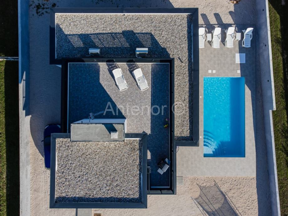 Kuća se nalazi 2 km od mora u mjestu Vrsi. Kuća se sastoji od prizemlja i krovne terase. U prizemlju se nalazi dnevni boravak, kuhinja, blagavaona, tri spavaće sobe, tri kupaonice, ulazni prostor, wc, hodnik i terasa.