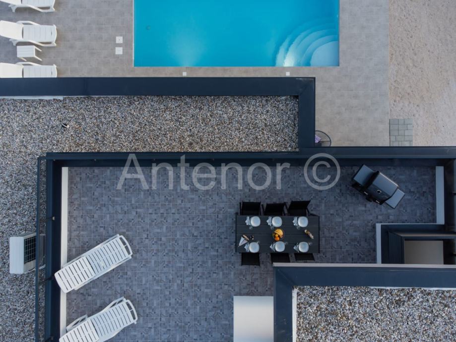 U dvorištu kuće nalazi se bazen od 33 m2. Vanjskim stubištem dolazi se na krovnu terasu površine 77 m2. Dio terase je natkriven (20 m2), a ostatak je nenatkriven.