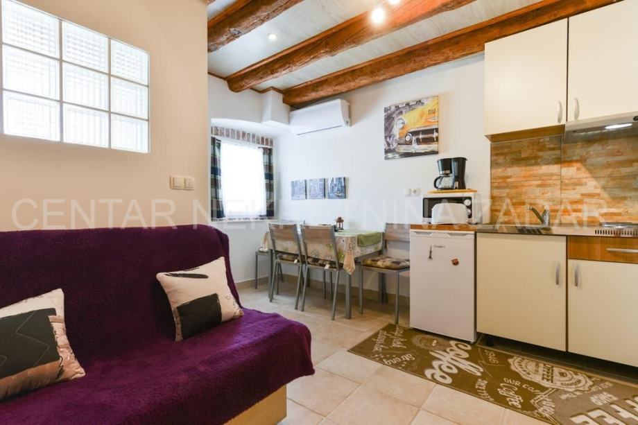 U prizemlju desne kuće nalazi se velika prostorija za prijateljska okupljanja, a na katu je jednosobni stan s malom terasom pred ulazom. U lijevoj kući je pet studio apartmana – dva u prizemlju i tri na katu, u koje se ulazi sa zajedničke terase. Svi apartmani su klimatizirani, potpuno opremljeni i uspješno se iznajmljuju. Moguće je uređenje još dva manja apartmana.