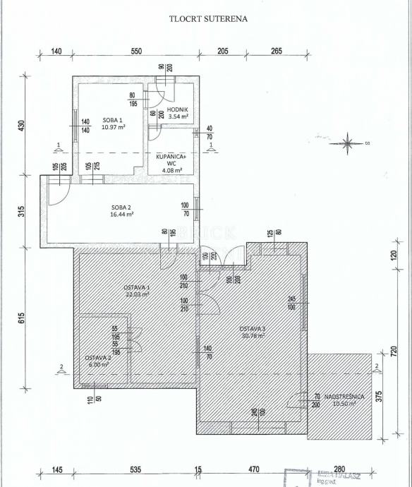 Suteren, površine 88 m2: 1 soba, 1 prostorija, 2 velike ostave, kupaonica i hodnik.
