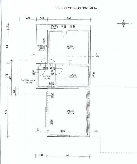 Visoko prizemlje, površine 36 m2: 2 sobe, hodnik i balkon. Garaža površine 29 m2.