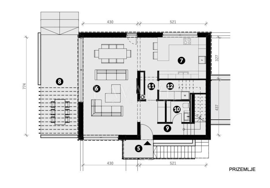- PRIZEMLJA površine 130 m2 - dnevni boravak s kuhinjom i blagovaonicom, predprostor, degažman, wc, terasa s vrtom