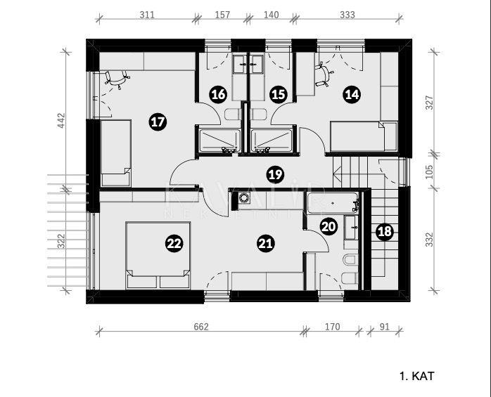 - 1. KATA površine 70 m2 - master spavaća soba s walk-in ormarom te kupaonicom s wc-om, dvije spavaće sobe s vlastitim kupaonicama, hodnik