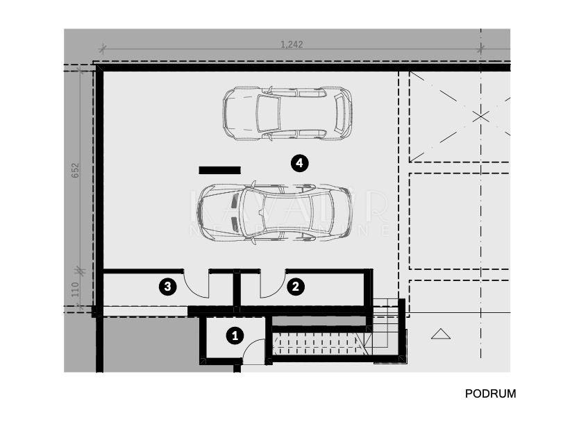 - PODRUM površine 51 m2 - garaža za minimalno dva automobila, sauna, teretana