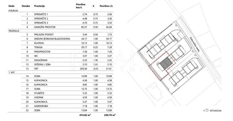 Površina kuće iznosi 250 m2 s obračunatim koeficijentima dok stambena površina kuće iznosi 150 m2.
