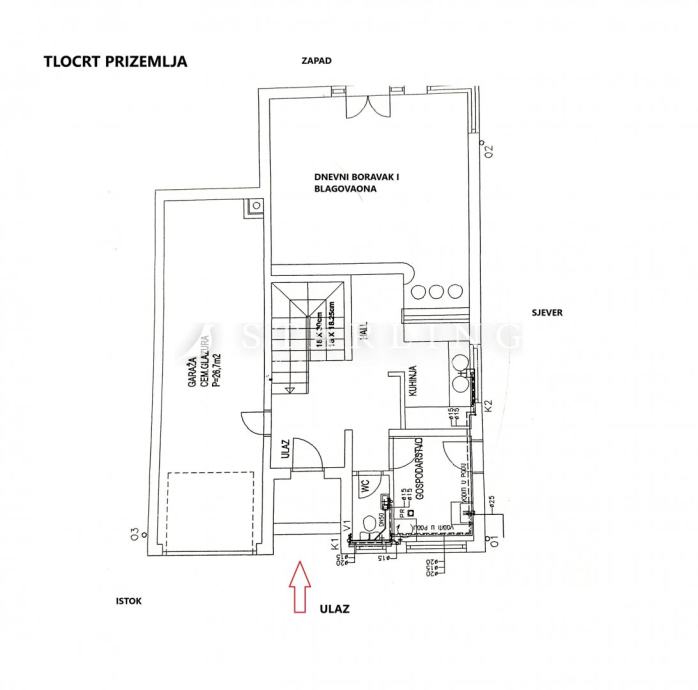 PRIZEMLJE: prilazni podest, dnevni boravak s blagovaonicom, kuhinja, predprostor, wc, ostava i gospodarstvo te garaža za dva automobila.